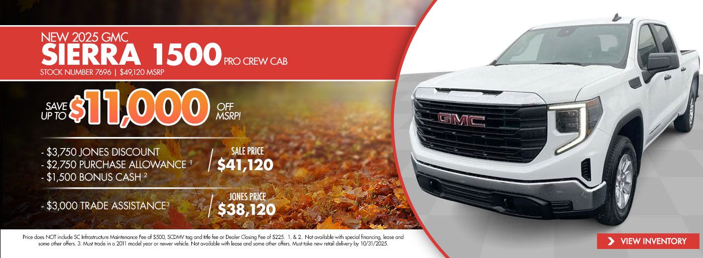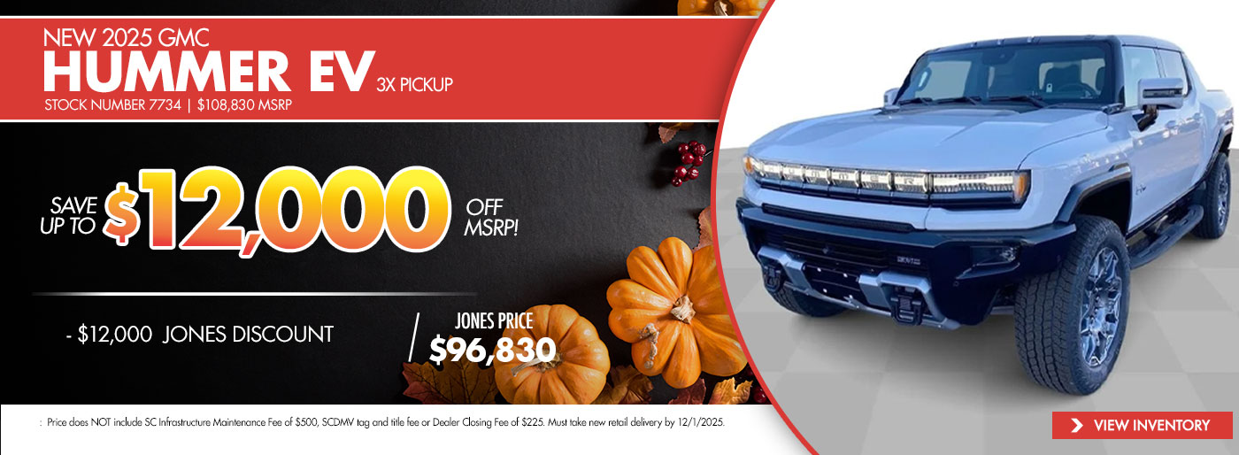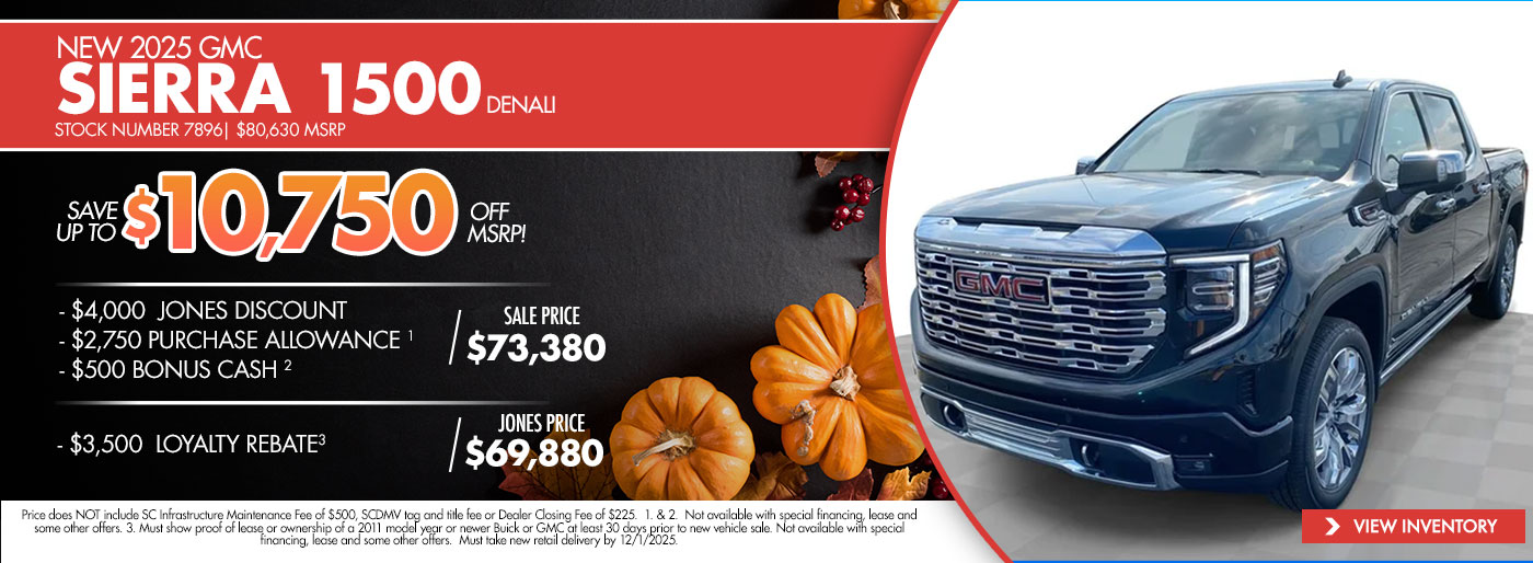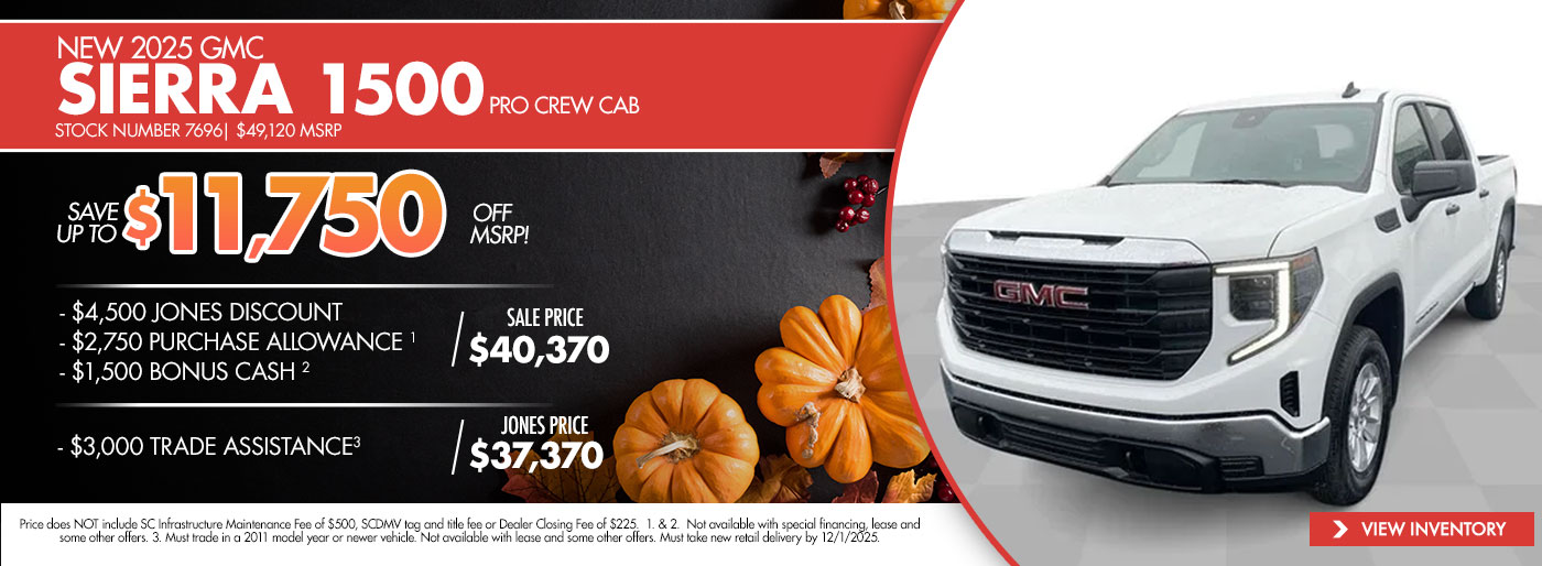 Thank you for visiting Jones GMC! Check out our monthly new vehicle specials below! Give us a call or stop by the dealership to find out more about these and all the other great deals we have available!