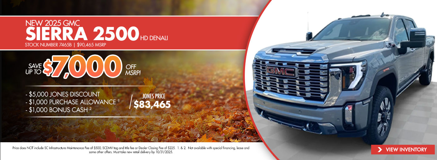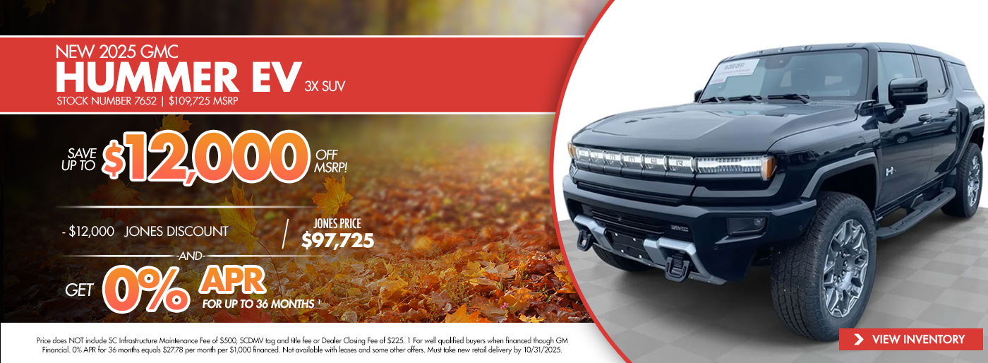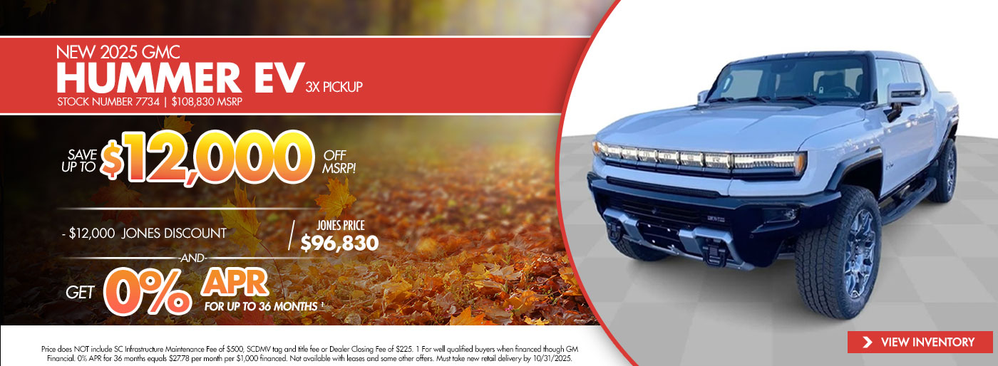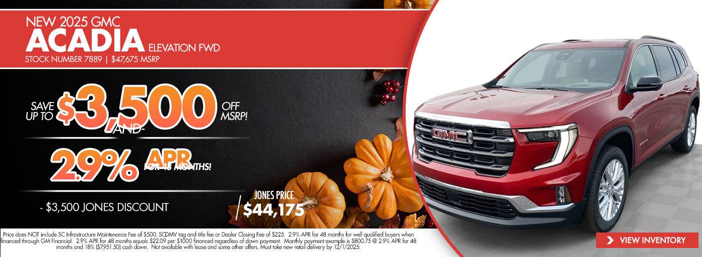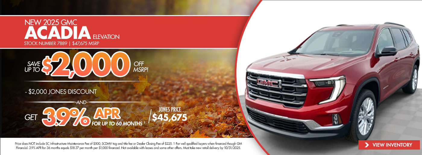 Thank you for visiting Jones GMC! Check out our monthly new vehicle specials below! Give us a call or stop by the dealership to find out more about these and all the other great deals we have available!