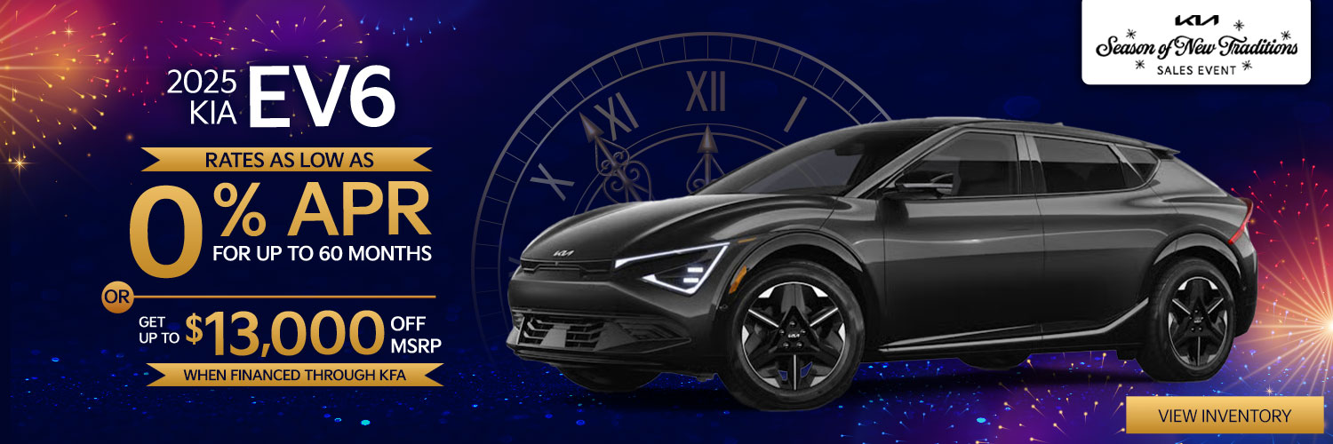 With approved credit to well-qualified buyers through KFA, all may not qualify. 2025 Kia EV6 Stock: EKN15769 Model: N4352 MSRP $53,175. 0% APR Financing for 60 months equals $16.67 per $1,000 financed regardless of down payment. Price includes $749 dealer processing fee. Offer excludes tax, tag, title, registration, and Georgia Lemon Law. Art for illustrative purposes only. Some restrictions may apply. Subject to prior sale. See dealer for complete details. Offer good through 12/31/2025.