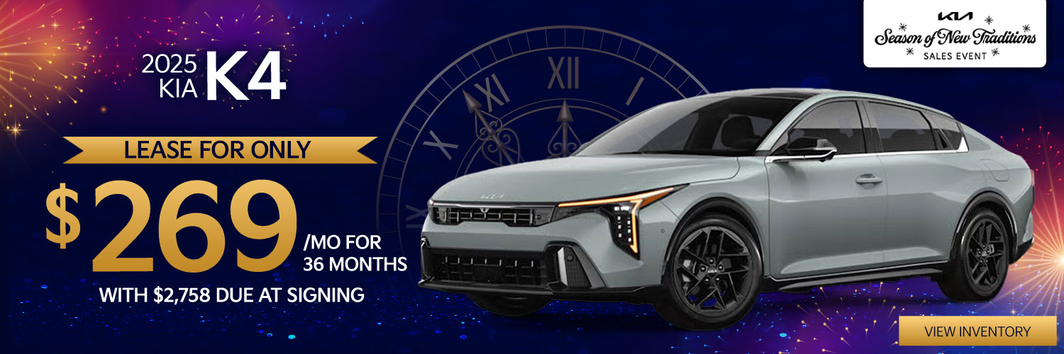 With approved credit, not all may qualify. 2025 Kia K4 Stock: KN15510 Model: 23442 MSRP $25,340 Lease for $269 a month for 36 months with 10k miles per year allowed, penalty of $.20 per mile over. $2,499 down payment and first payment due at signing. Residual $15,710. Total payments $9,684. $650 acquisition fee. No security deposit required. $400 termination fee. Price includes $749 dealer processing fee. Offer excludes tax, tag, title, registration and Georgia Lemon Law. Art for illustrative purposes only. Some restrictions may apply. Subject to prior sale. See dealer for complete details. Offer good through 12/31/2025.