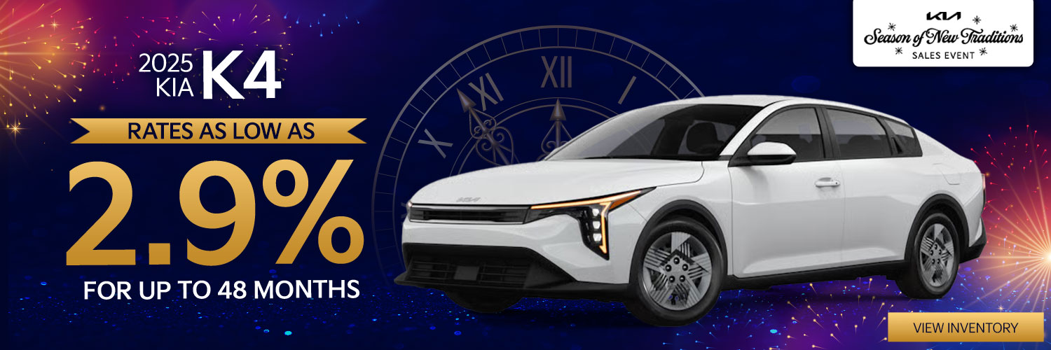 With approved credit to well-qualified buyers through KFA, all may not qualify. Available on select new MY25 Kia K4 Models. 2.9% APR Financing for 48 months equals $22.09 per $1,000 financed regardless of down payment. Price includes $749 dealer processing fee. Offer excludes tax, tag, title, registration, and Georgia Lemon Law. Art for illustrative purposes only. Some restrictions may apply. Subject to prior sale. See dealer for complete details. Offer good through 12/31/2025.