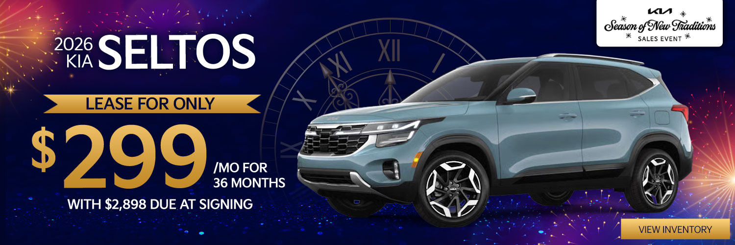 With approved credit, not all may qualify. 2026 Kia Seltos S Stock: KN15568 Model: K2232 MSRP $27,370. Lease for $299 a month for 36 months with 10k miles per year allowed, penalty of $.20 per mile over. $2,599 down payment and first payment due at signing. Residual $17,790. Total payments $10,764. $650 acquisition fee. No security deposit required. $400 termination fee. Price includes $749 dealer processing fee. Offer excludes tax, tag, title, registration and Georgia Lemon Law. Art for illustrative purposes only. Some restrictions may apply. Subject to prior sale. See dealer for complete details. Offer good through 12/31/2025.