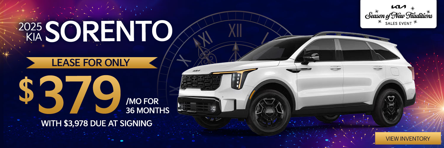 With approved credit, not all may qualify. 2025 Kia Sorento Stock: KN15537 Model: 73232 MSRP $38,735. Lease for $379 a month for 36 months with 10k miles per year allowed, penalty of $.20 per mile over. $3,599 down payment and first payment due at signing. Residual $22,466. Total payments $13,644. $650 acquisition fee. No security deposit required. $400 termination fee. Price includes $749 dealer processing fee. Offer excludes tax, tag, title, registration and Georgia Lemon Law. Art for illustrative purposes only. Some restrictions may apply. Subject to prior sale. See dealer for complete details. Offer good through 12/31/2025.