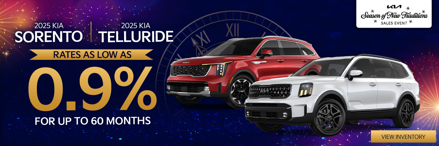 With approved credit to well-qualified buyers through KFA, all may not qualify. Available on select new MY26 Kia Sorento & Telluride models. 0.9% APR Financing for 60 months equals $17.05 per $1,000 financed regardless of down payment. Price includes $749 dealer processing fee. Offer excludes tax, tag, title, registration and Georgia Lemon Law. Art for illustrative purposes only. Some restrictions may apply. Subject to prior sale. See dealer for complete details. Offer good through 12/31/2025.