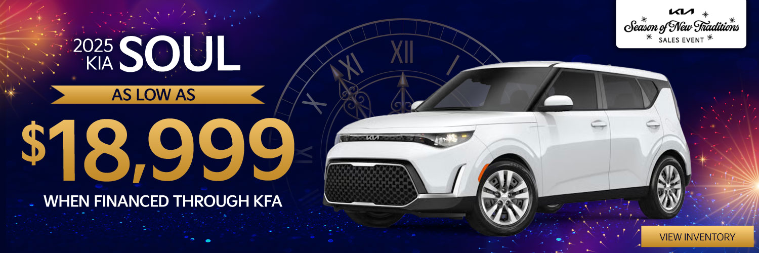 With approved credit to well-qualified buyers through KFA, all may not qualify. Available on select new MY25 Kia Soul Models. Example: 2025 Kia Soul LX Stock: KN15637 Model: B2522 MSRP $22,185 Sale Price $18,999. Price includes $749 dealer processing fee. Offer excludes tax, tag, title, registration, and Georgia Lemon Law. Art for illustrative purposes only. Some restrictions may apply. Subject to prior sale. See dealer for complete details. Offer good through 12/31/2025.