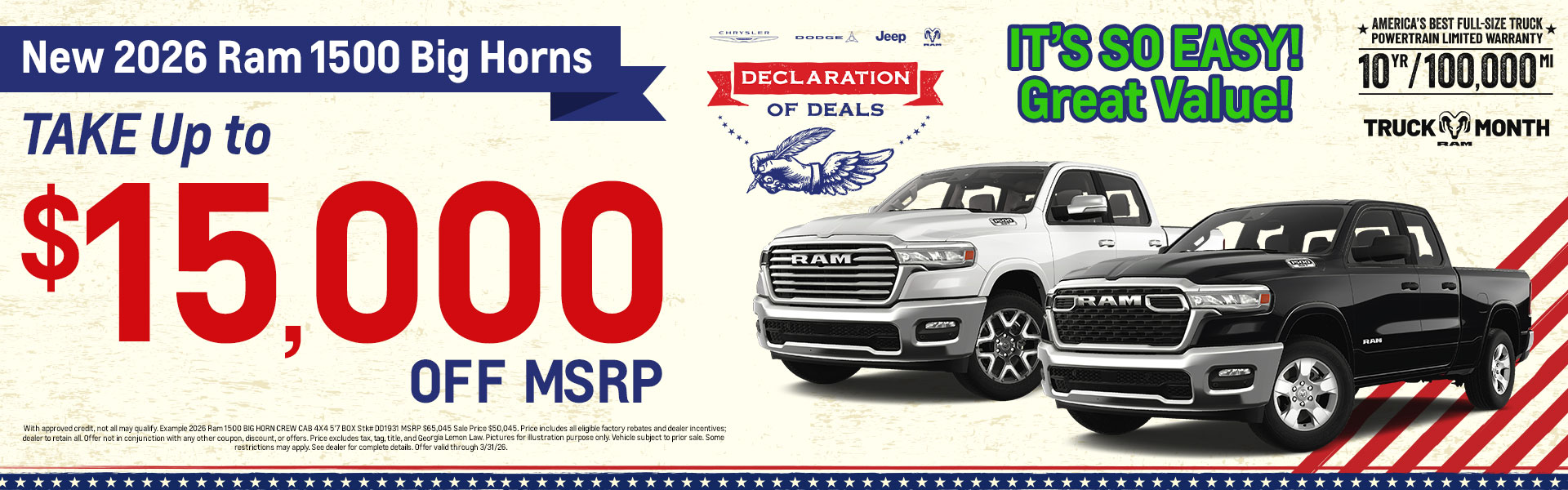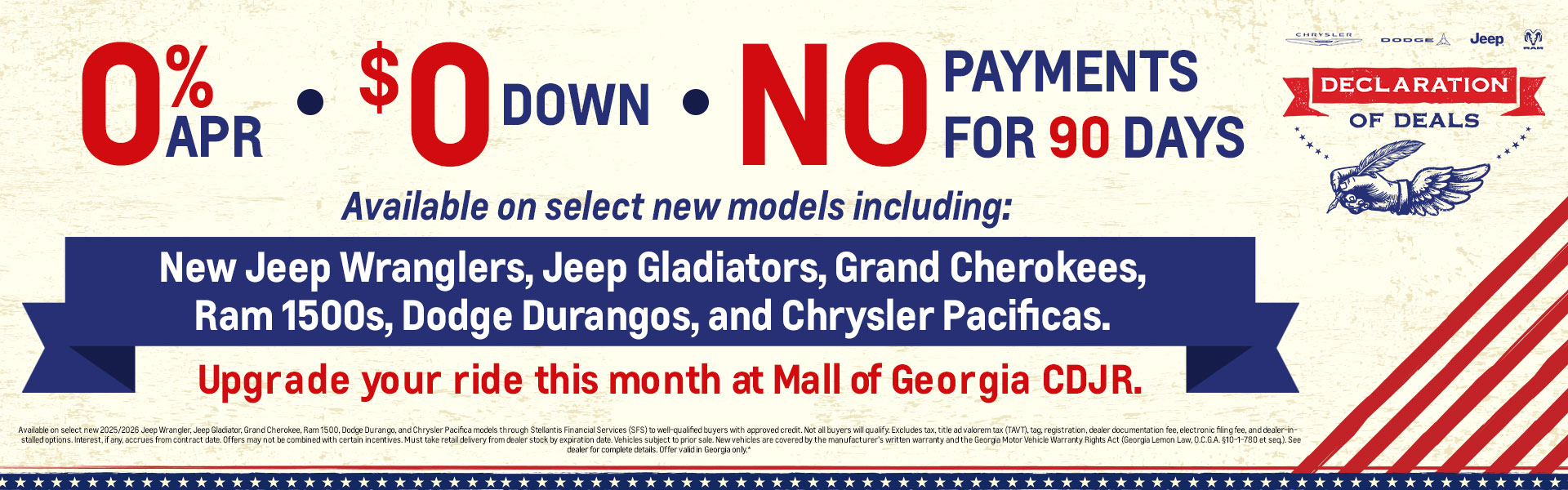 Thanks for visiting Mall of Georgia Chrysler Dodge Jeep Ram, a premier Buford CDJR dealer! As a premier CDJR dealer, we have a huge selection of new and used RAMS from which to choose. The vehicles below are part of our monthly sales event. Stop by today to check out these and other offers we have available.
