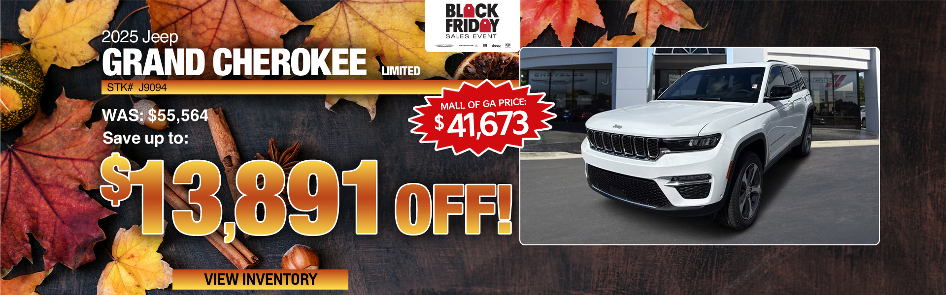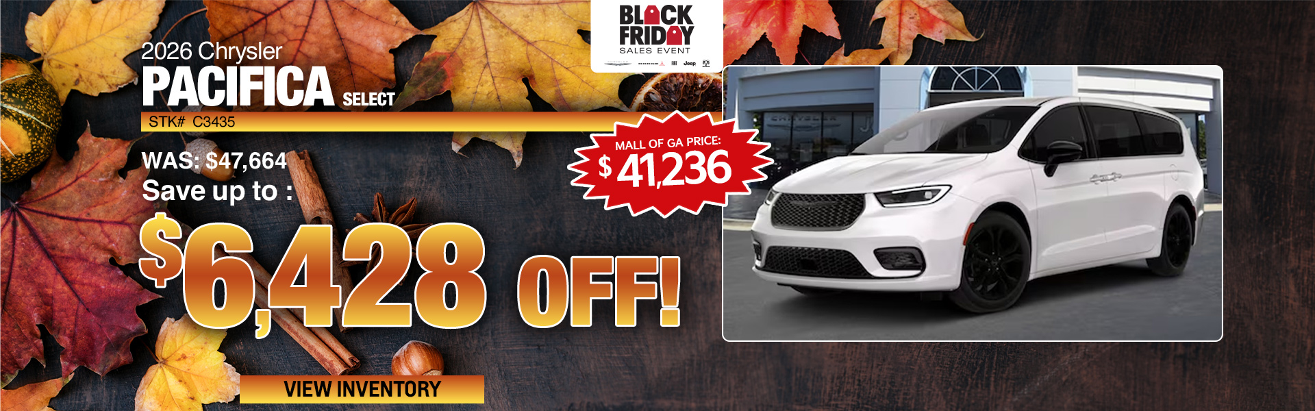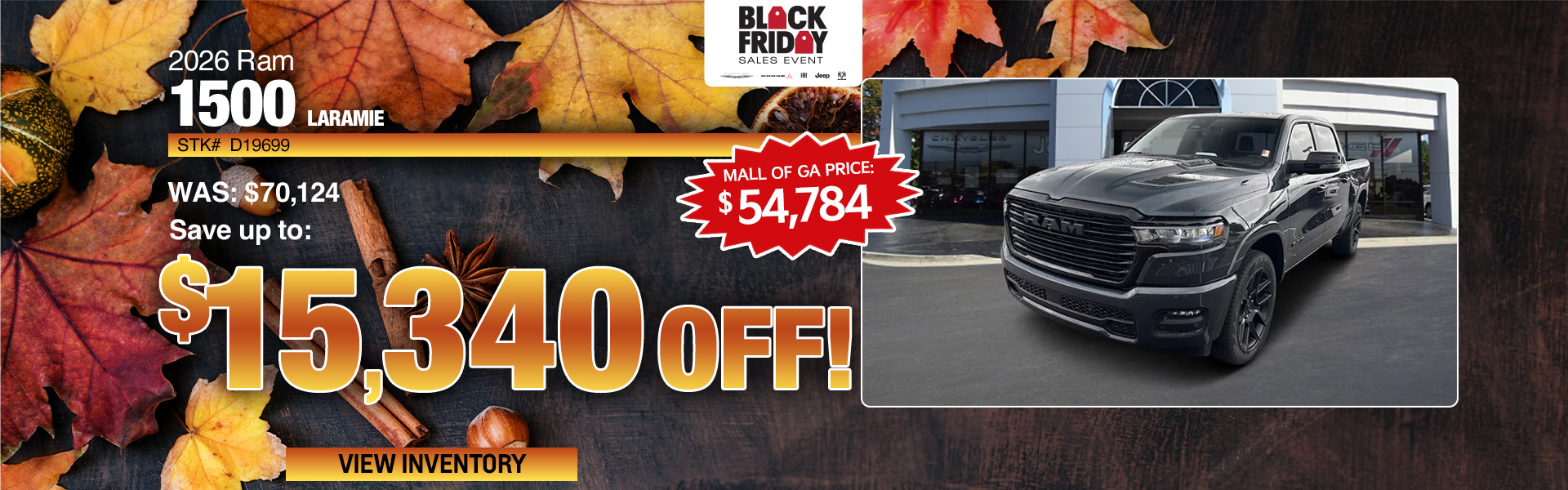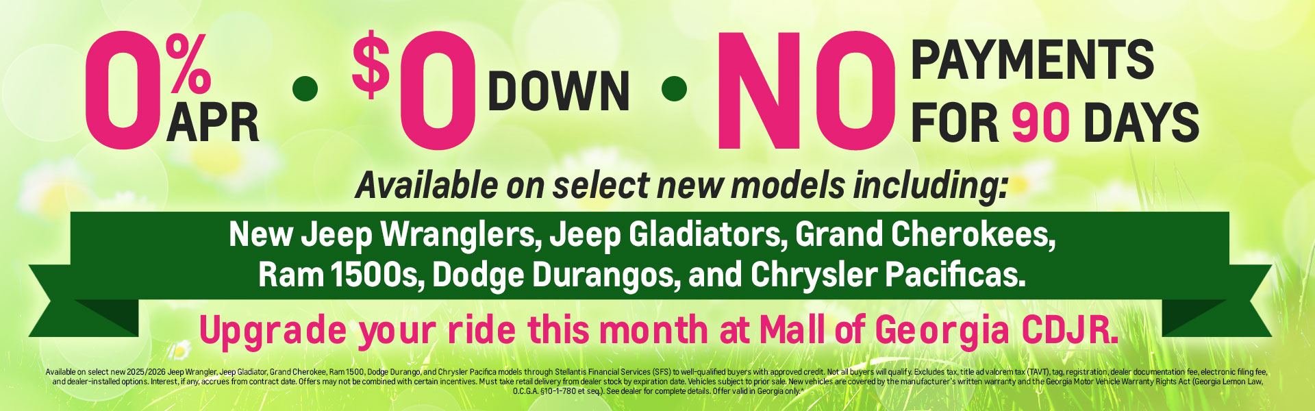 Thanks for visiting Mall of Georgia Chrysler Dodge Jeep Ram, a premier Buford CDJR dealer! As a premier CDJR dealer, we have a huge selection of new and used Chryslers, Dodges, Jeeps, and RAMS from which to choose. The vehicles below are part of our monthly sales event. Stop by today to check out these and other offers we have available.