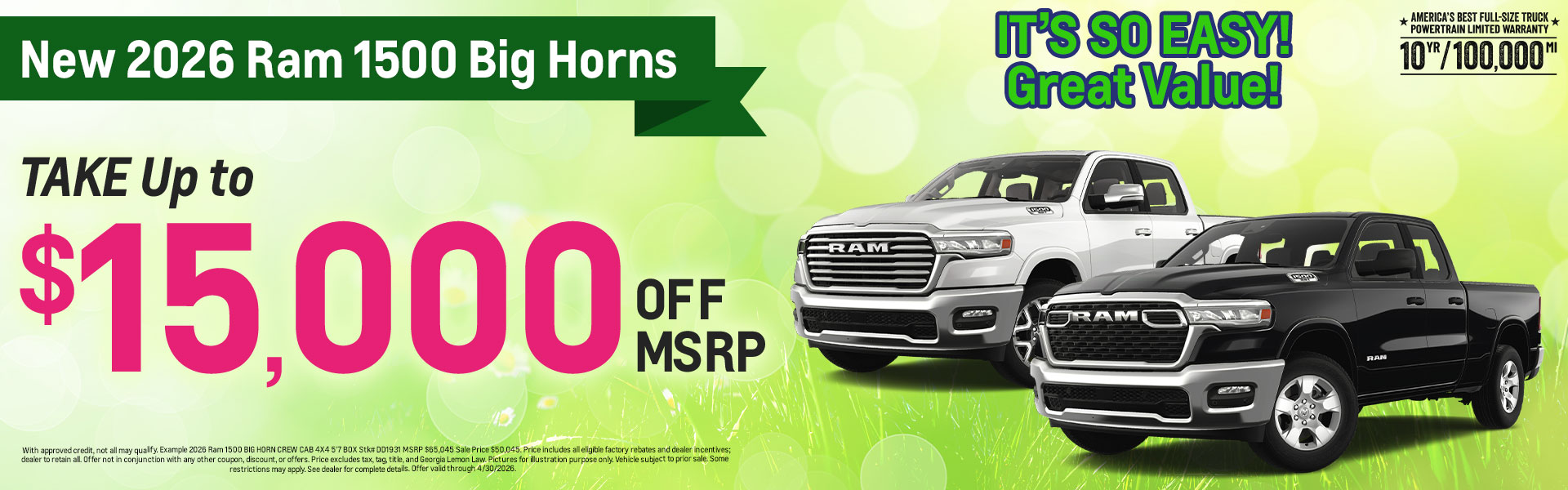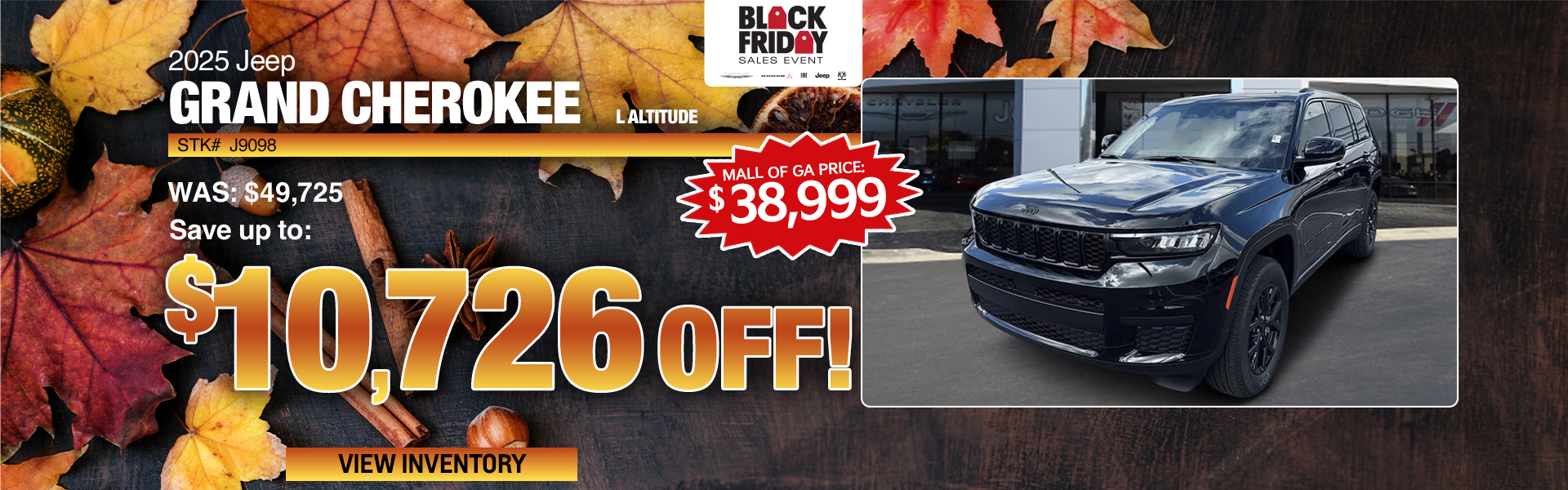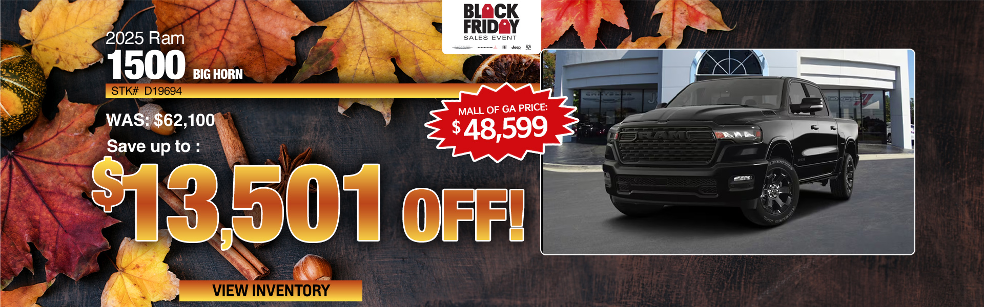 Thanks for visiting Mall of Georgia Chrysler Dodge Jeep Ram, a premier Buford CDJR dealer! As a premier CDJR dealer, we have a huge selection of new and used Chryslers, Dodges, Jeeps, and RAMS from which to choose. The vehicles below are part of our monthly sales event. Stop by today to check out these and other offers we have available.