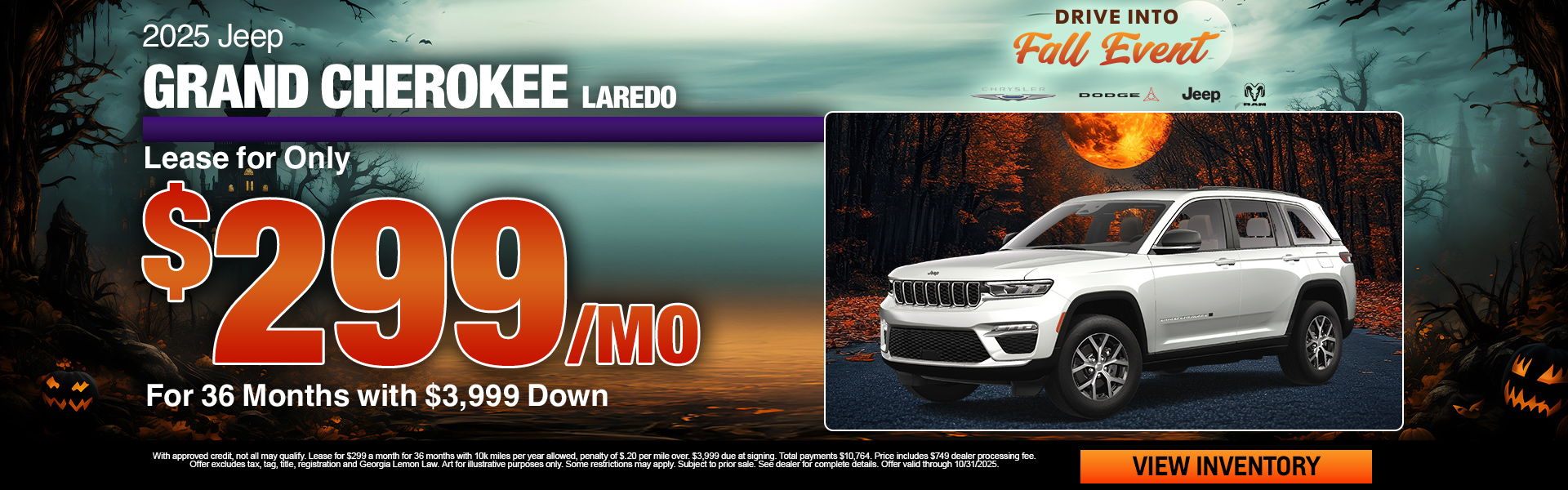 With approved credit, not all may qualify. Lease for $299 a month for 36 months with 10k miles per year allowed, penalty of $.20 per mile over. $3,999 due at signing. Total payments $10,764. Price includes $749 dealer processing fee. Offer excludes tax, tag, title, registration and Georgia Lemon Law. Art for illustrative purposes only. Some restrictions may apply. Subject to prior sale. See dealer for complete details. Offer valid through 10/31/2025.