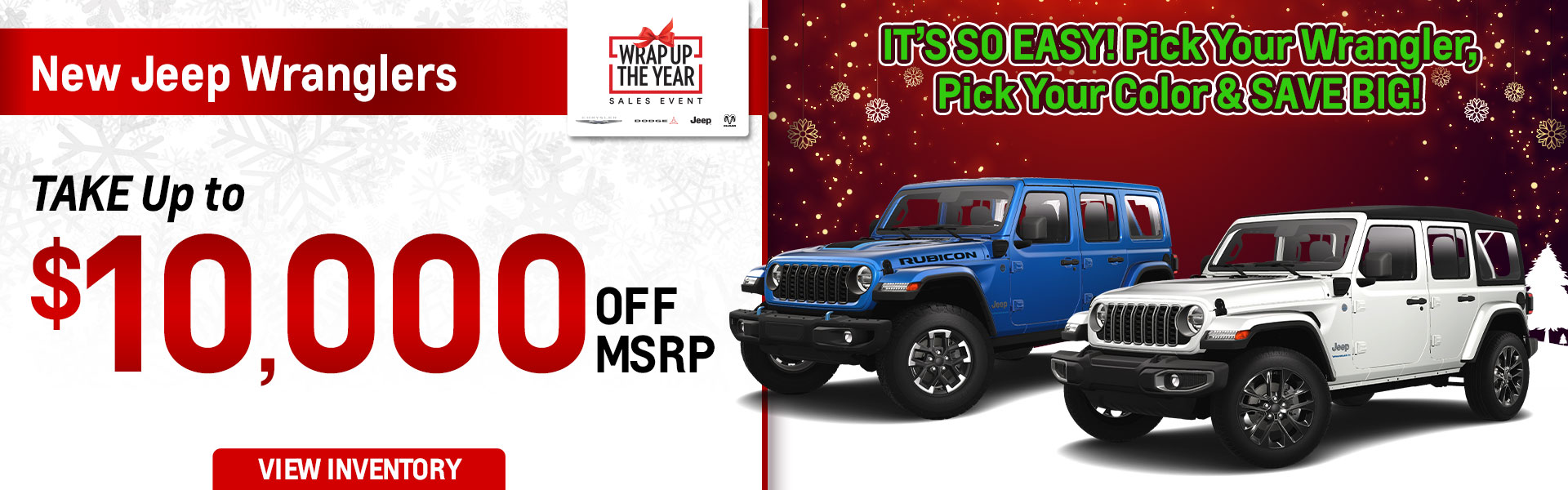 With approved credit, not all may qualify. Example 2025 Jeep Wrangler 4-DOOR SPORT S Stk# JJ1898 MSRP $52,840 Sale Price $42,840. Price includes all eligible factory rebates and dealer incentives; dealer to retain all. Offer not in conjunction with any other coupon, discount, or offers. Price excludes tax, tag, title, and Georgia Lemon Law. Pictures for illustration purpose only. Vehicle subject to prior sale. Some restrictions may apply. See dealer for complete details. Offer valid through 12/31/2025.