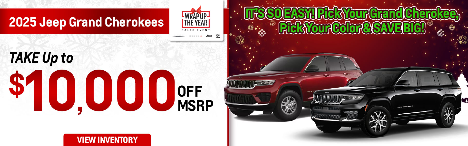 With approved credit, not all may qualify. Example 2025 Jeep Grand Cherokee LIMITED 4X4 Stk# J9094 MSRP $54,965 Sale Price $44,965. Price includes all eligible factory rebates and dealer incentives; dealer to retain all. Offer not in conjunction with any other coupon, discount, or offers. Price excludes tax, tag, title, and Georgia Lemon Law. Pictures for illustration purpose only. Vehicle subject to prior sale. Some restrictions may apply. See dealer for complete details. Offer valid through 12/31/2025.