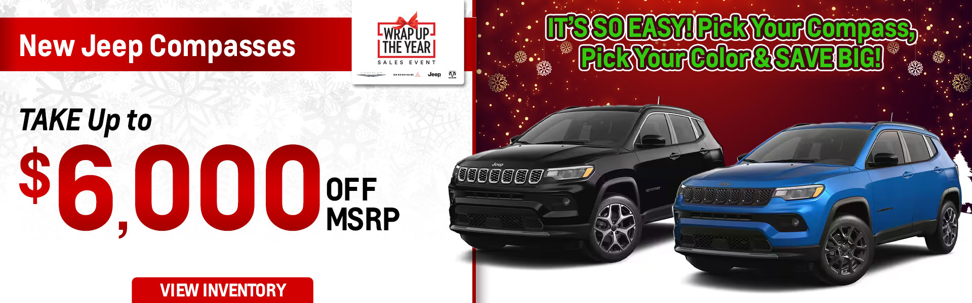 With approved credit, not all may qualify. Example 2026 Jeep Compass LATITUDE ALTITUDE 4X4 Stk# J9161. MSRP $30,990 Sale Price $24,990. Price includes all eligible factory rebates and dealer incentives; dealer to retain all. Offer not in conjunction with any other coupon, discount, or offers. Price excludes tax, tag, title, and Georgia Lemon Law. Pictures for illustration purpose only. Vehicle subject to prior sale. Some restrictions may apply. See dealer for complete details. Offer valid through 12/31/2025.