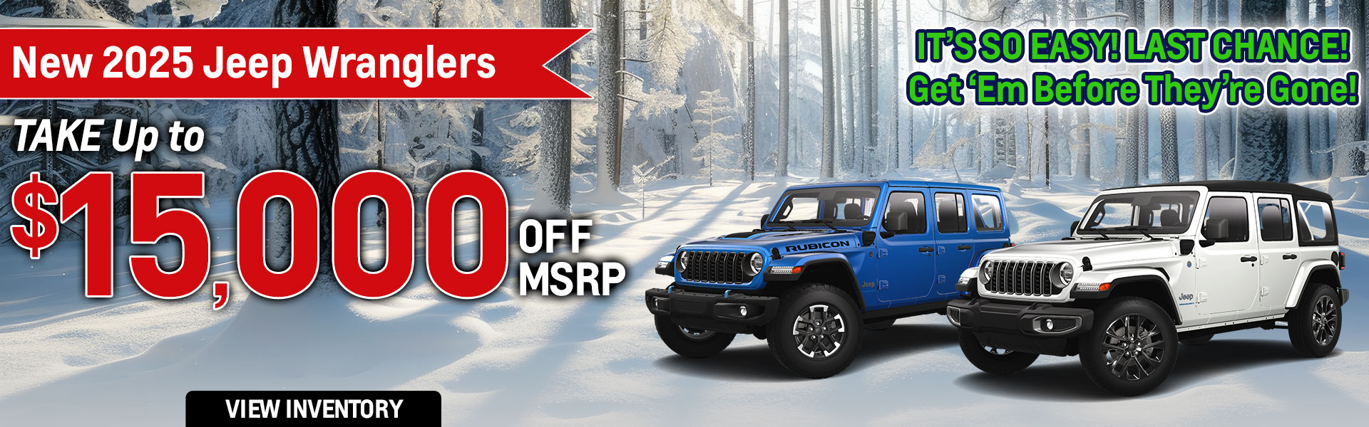 With approved credit, not all may qualify. Example 2025 Jeep Wrangler 4-DOOR WILLYS Stk# J9114 MSRP $54,480 Sale Price $39,480. Price includes all eligible factory rebates and dealer incentives; dealer to retain all. Offer not in conjunction with any other coupon, discount, or offers. Price excludes tax, tag, title, and Georgia Lemon Law. Pictures for illustration purpose only. Vehicle subject to prior sale. Some restrictions may apply. See dealer for complete details. Offer valid through 02/28/2026.