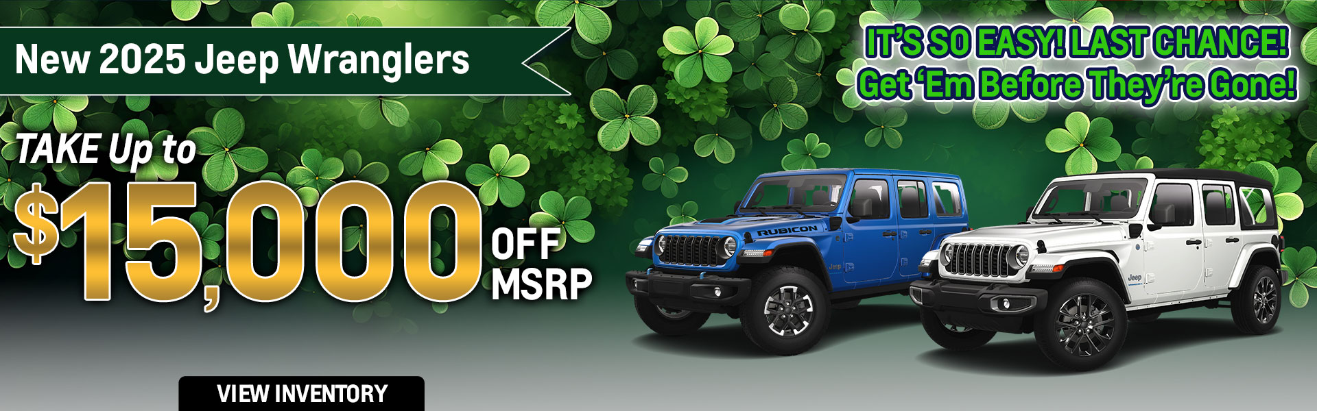 With approved credit, not all may qualify. Example 2025 Jeep Wrangler 4-DOOR WILLYS Stk# J9114 MSRP $54,480 Sale Price $39,480. Price includes all eligible factory rebates and dealer incentives; dealer to retain all. Offer not in conjunction with any other coupon, discount, or offers. Price excludes tax, tag, title, and Georgia Lemon Law. Pictures for illustration purpose only. Vehicle subject to prior sale. Some restrictions may apply. See dealer for complete details. Offer valid through 03/31/2026.