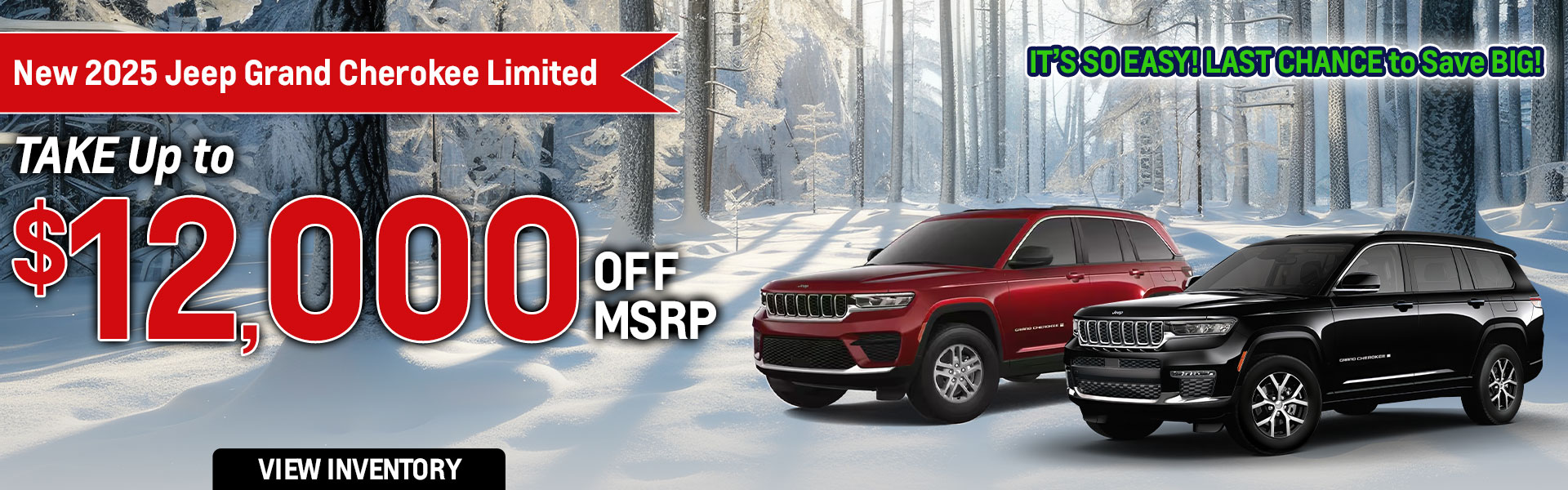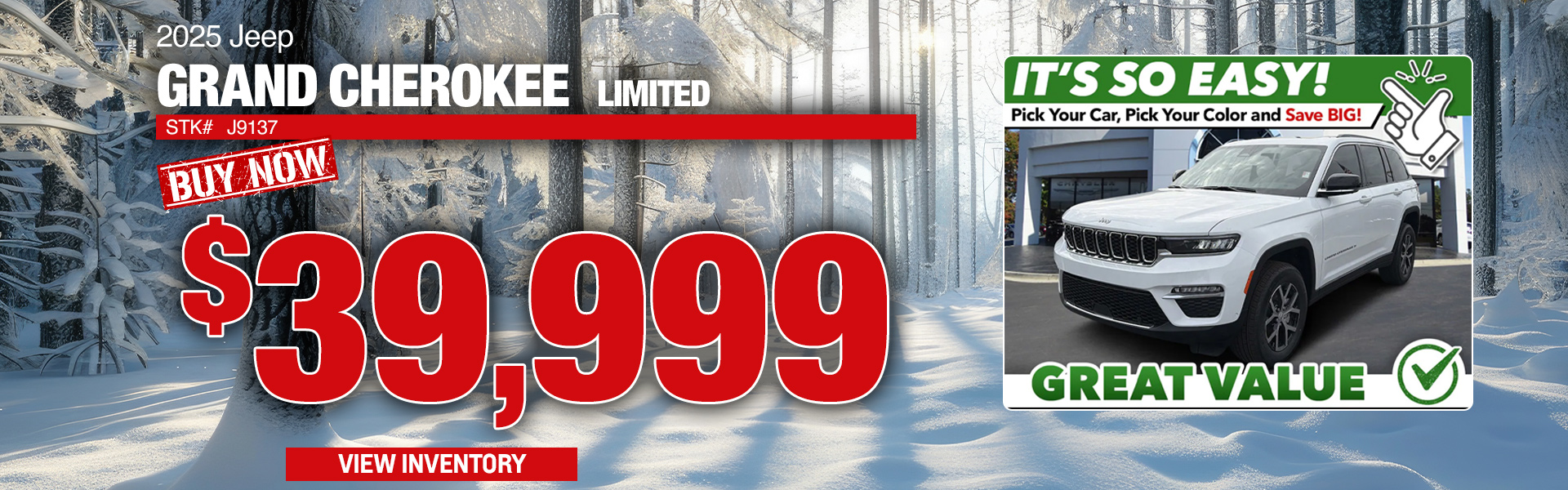 With approved credit, not all may qualify. Example 2025 Jeep Grand Cherokee LIMITED 4X4 Stk# J9137 MSRP $52,340 Sale Price $40,340. Price includes all eligible factory rebates and dealer incentives; dealer to retain all. Offer not in conjunction with any other coupon, discount, or offers. Price excludes tax, tag, title, and Georgia Lemon Law. Pictures for illustration purpose only. Vehicle subject to prior sale. Some restrictions may apply. See dealer for complete details. Offer valid through 02/28/2026.