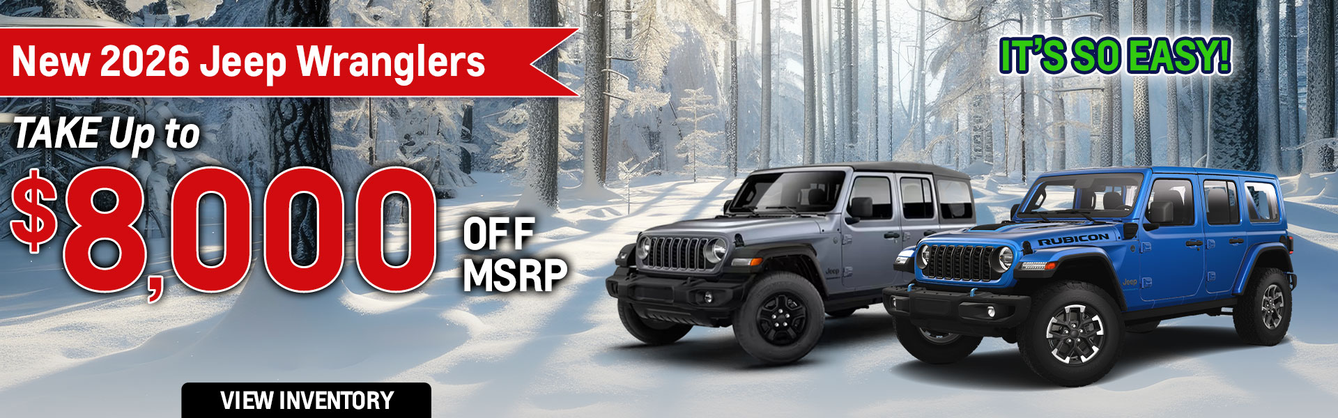 With approved credit, not all may qualify. Example 2026 Jeep Wrangler 4-DOOR SPORT Stk# J9195 MSRP $45,850 Sale Price $ 37,850. Price includes all eligible factory rebates and dealer incentives; dealer to retain all. Offer not in conjunction with any other coupon, discount, or offers. Price excludes tax, tag, title, and Georgia Lemon Law. Pictures for illustration purpose only. Vehicle subject to prior sale. Some restrictions may apply. See dealer for complete details. Offer valid through 02/28/2026.