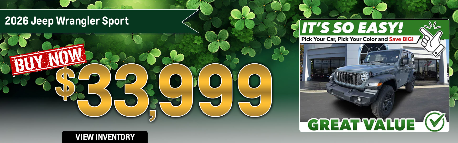 With approved credit, not all may qualify. Example 2026 Jeep Wrangler Sport Stk# J9156. Sale Price $33,999. Price includes all eligible factory rebates and dealer incentives; dealer to retain all. Price excludes tax, tag, title, and government fees. Pictures for illustration purposes only. Vehicle subject to prior sale. Some restrictions may apply. See dealer for complete details. Offer valid through 03/31/2026.
