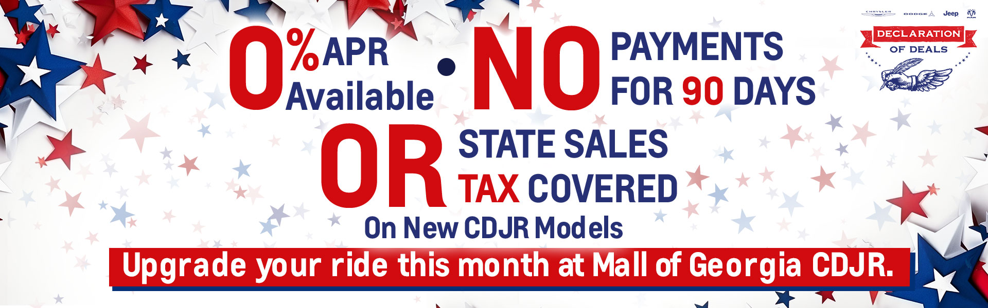 Available on select new 2025/2026 Jeep Wrangler, Jeep Gladiator, Grand Cherokee, Ram 1500, Dodge Durango, and Chrysler Pacifica models through Stellantis Financial Services (SFS) to well-qualified buyers with approved credit. Not all buyers will qualify. Excludes tax, title ad valorem tax (TAVT), tag, registration, dealer documentation fee, electronic filing fee, and dealer-installed options. Interest, if any, accrues from contract date. Offers may not be combined with certain incentives. Must take retail delivery from dealer stock by expiration date. Vehicles subject to prior sale. New vehicles are covered by the manufacturer’s written warranty and the Georgia Motor Vehicle Warranty Rights Act (Georgia Lemon Law, O.C.G.A. §10-1-780 et seq.). See dealer for complete details. Offer valid in Georgia only.*