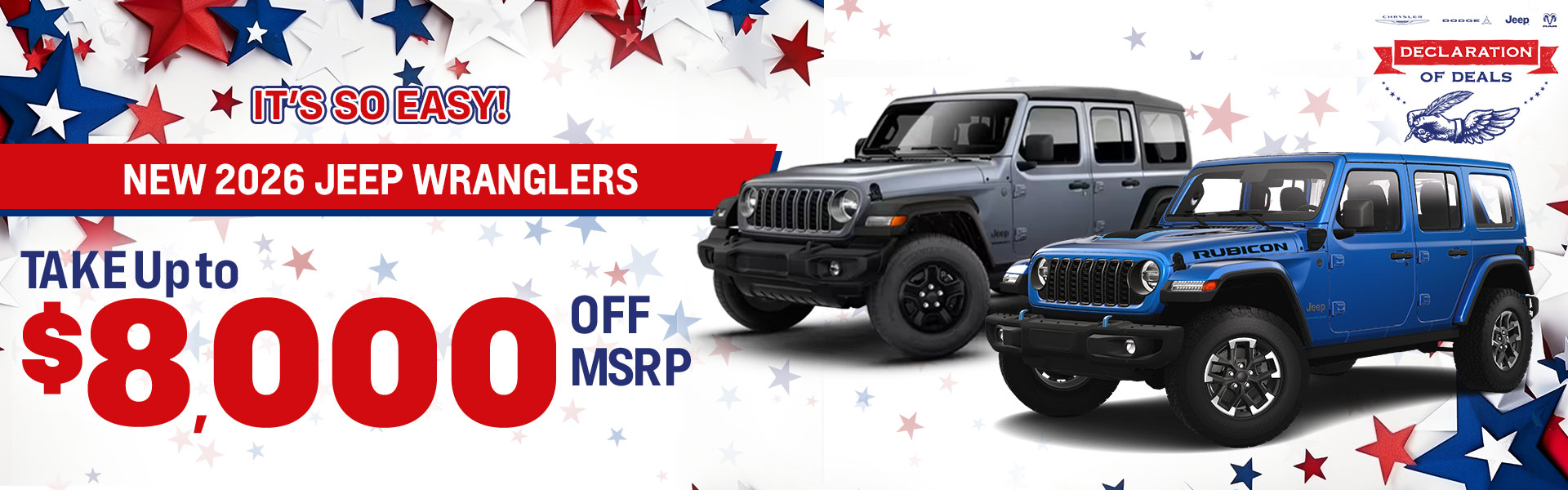 With approved credit, not all may qualify. Example 2026 Jeep Wrangler 4-DOOR SPORT Stk# J9195 MSRP $45,850 Sale Price $ 37,850. Price includes all eligible factory rebates and dealer incentives; dealer to retain all. Offer not in conjunction with any other coupon, discount, or offers. Price excludes tax, tag, title, and Georgia Lemon Law. Pictures for illustration purpose only. Vehicle subject to prior sale. Some restrictions may apply. See dealer for complete details. Offer valid through 4/30/26.