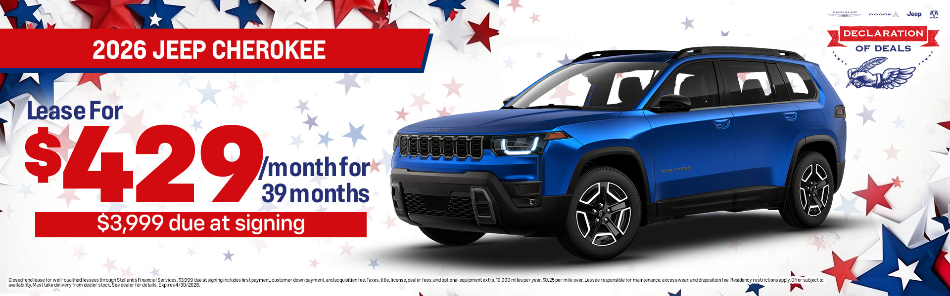 0% APR financing for 36 months available on a new 2026 Jeep Cherokee to well-qualified buyers through Stellantis Financial Services. Not all buyers will qualify. Example: $27.78 per $1,000 financed for 36 months at 0% APR. No payments for 90 days available to qualified buyers; interest accrues from date of purchase. Taxes, title, license, dealer fees, and optional equipment extra. Must take delivery from dealer stock. Residency restrictions may apply. See dealer for complete details. Offer expires 4/30/2026.