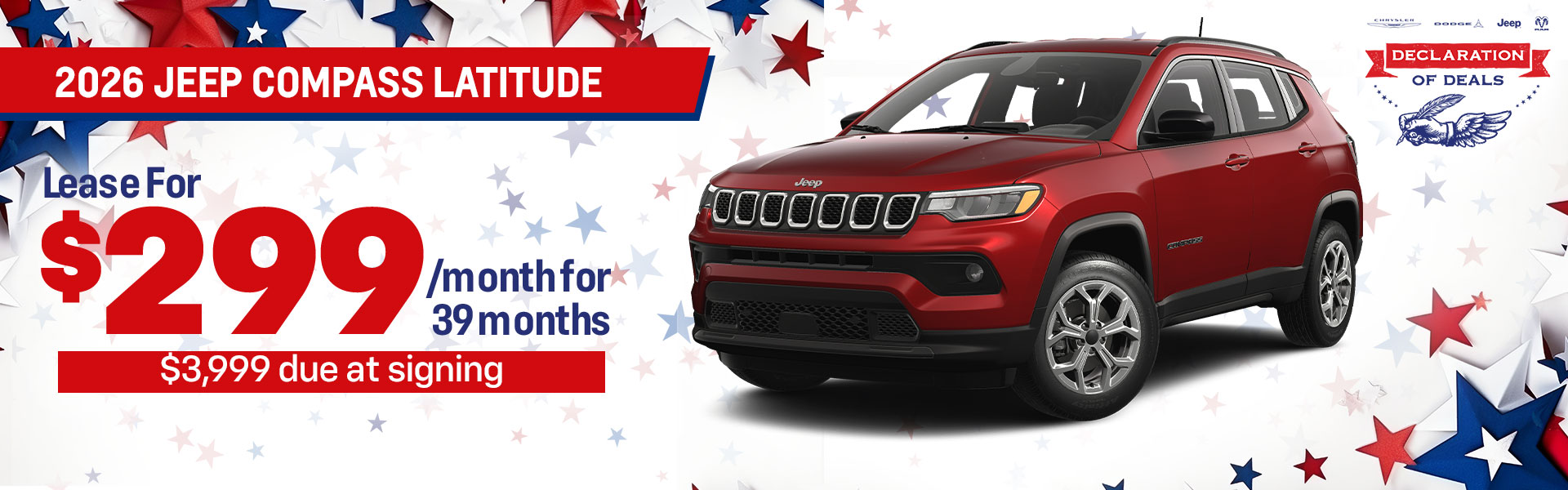 Closed-end lease for well-qualified lessees through Stellantis Financial Services. $3,999 due at signing includes first payment, customer down payment, and acquisition fee. Taxes, title, license, dealer fees, and optional equipment extra. 10,000 miles per year. $0.25 per mile over. Lessee responsible for maintenance, excess wear, and disposition fee. Residency restrictions apply. Offer subject to availability. Must take delivery from dealer stock. See dealer for details. Expires 4/30/2026.