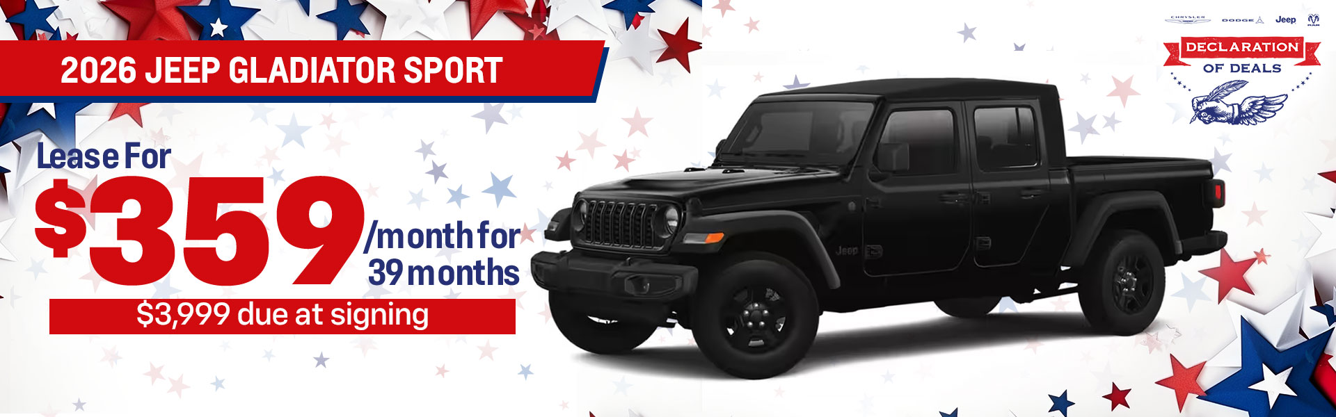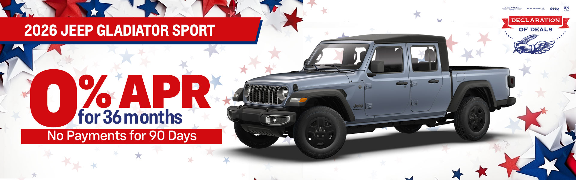 0% APR financing for 36 months available on a new 2026 Jeep Gladiator Sport to well-qualified buyers through Stellantis Financial Services. Not all buyers will qualify. Example: $27.78 per $1,000 financed for 36 months at 0% APR. No payments for 90 days available to qualified buyers; interest accrues from date of purchase. Taxes, title, license, dealer fees, and optional equipment extra. Must take delivery from dealer stock. Residency restrictions may apply. See dealer for complete details. Offer expires 4/30/2026.