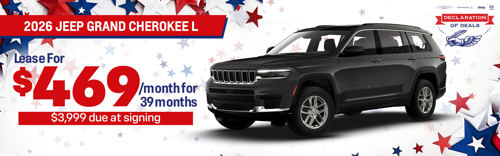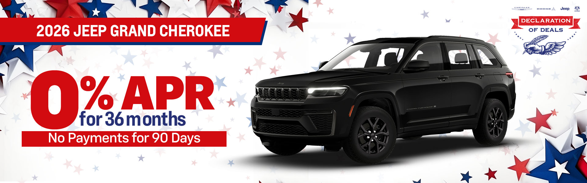 With approved credit, not all may qualify. Example 2025 Jeep Grand Cherokee LIMITED 4X4 Stk# J9137 MSRP $52,340 Sale Price $40,340. Price includes all eligible factory rebates and dealer incentives; dealer to retain all. Offer not in conjunction with any other coupon, discount, or offers. Price excludes tax, tag, title, and Georgia Lemon Law. Pictures for illustration purpose only. Vehicle subject to prior sale. Some restrictions may apply. See dealer for complete details. Offer valid through 4/30/26.