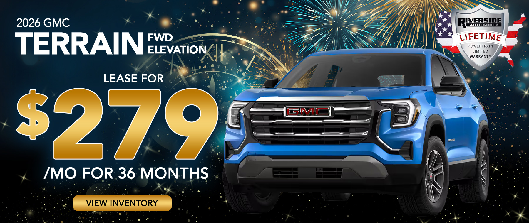 For Current Lessees of a 2020 model year or newer GM or Non-GM passenger car or truck at least 30 days prior to the lease of a new GM vehicle through GM Financial. Customer remains responsible for current lease payments. Each dealer sets own price. $279/month for 36 months. Your payments may vary. Payments are for a 2026 GMC Terrain FWD Elevation with an MSRP of $31,895. Based on due at signing amount of $5,189 (after all offers). 36 monthly payments total $10,044. Must show proof of lease. Option to purchase at lease end for an amount to be determined at lease signing. Lessor must approve lease. Lessee pays for maintenance, repair, excess wear and disposition fee of $495 or less at end of lease. No security deposit required. Payments may be higher in some states. Not available with other offers. Take new retail delivery by 02-02-2026. Lifetime limited non-factory warranty on all new vehicles. Good at participating dealerships nationwide. No additional charge. See dealer for details.