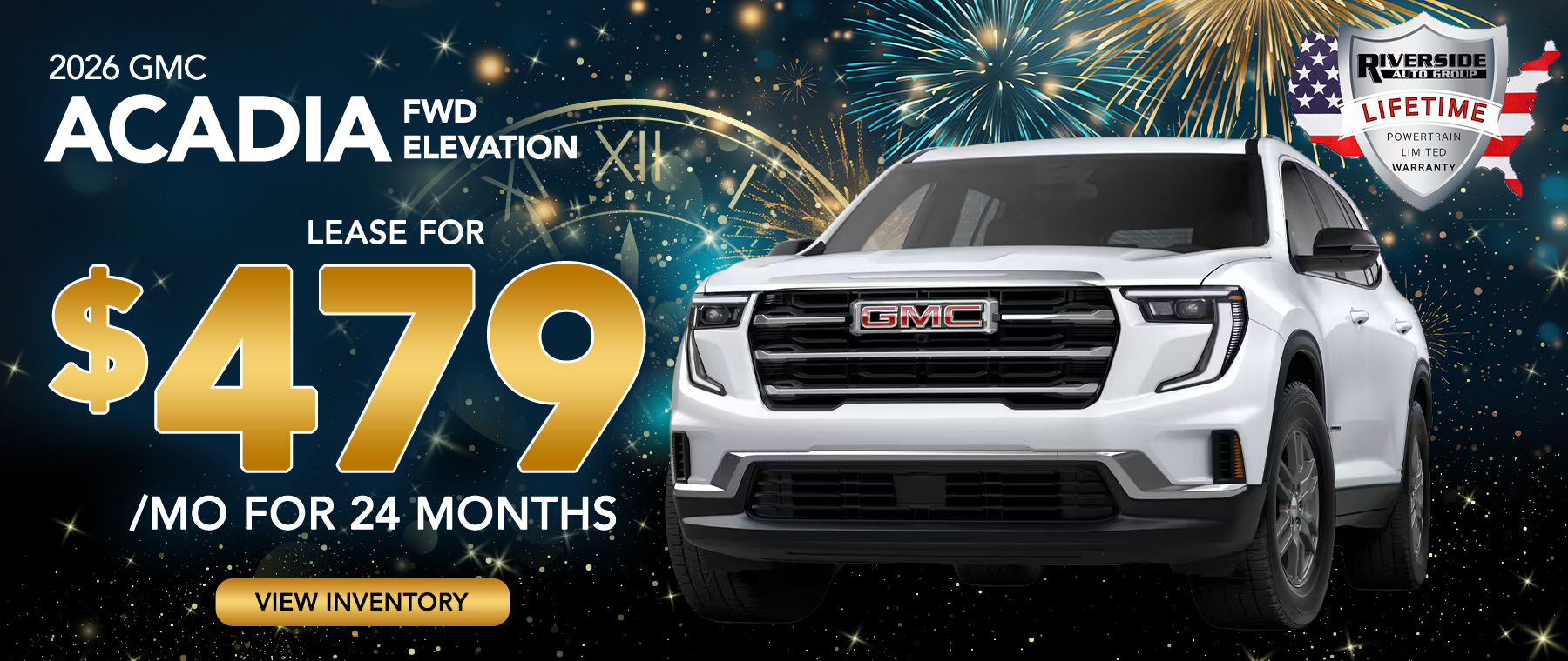 2026 GMC Acadia FWD Elevation $479/month for 24 months. Your payments may vary. For eligible new and unused models leased through GM Financial. Payments are for a 2026 GMC Acadia FWD Elevation with an MSRP of $45,595. Based on due at signing amount of $7,089 (after all offers). 24 monthly payments total $11,496. Option to purchase at lease end for an amount to be determined at lease signing. Lessor must approve lease. Take new retail delivery by 02-02-2026. Lessee pays for maintenance, repair, excess wear and disposition fee of $495 or less at end of lease. No security deposit required. Payments may be higher in some states. Not available with other offers. Lifetime limited non-factory warranty on all new vehicles. Good at participating dealerships nationwide. No additional charge. See dealer for details.
