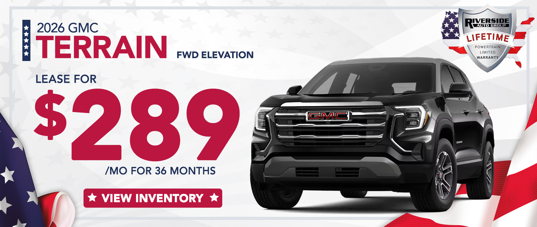 Example based on survey. Each dealer sets own price. $289/month for 36 months. Your payments may vary. For eligible new and unused models leased through GM Financial. Payments are for a 2026 GMC Terrain FWD Elevation with an MSRP of $32,195. Based on due at signing amount of $4,179 (after all offers). 36 monthly payments total $10,404. Option to purchase at lease end for an amount to be determined at lease signing. Lessor must approve lease. Take new retail delivery by 03-02-2026. Lessee pays for maintenance, repair, excess wear and disposition fee of $495 or less at end of lease. No security deposit required. Payments may be higher in some states. Not available with other offers. Lifetime limited non-factory warranty on all new vehicles. Good at participating dealerships nationwide. No additional charge. See dealer for details.