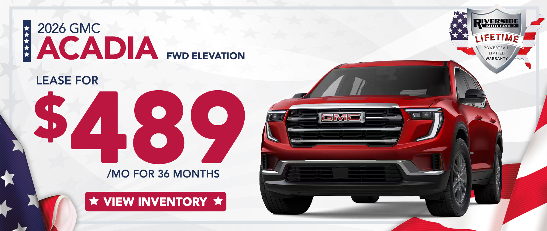 Payments are for a 2026 GMC Acadia FWD Elevation with an MSRP of $45,795. Based on due at signing amount of $7,549 (after all offers). 36 monthly payments total $17,604. Option to purchase at lease end for an amount to be determined at lease signing. Lessor must approve lease. Take new retail delivery by 03-02-2026. Lessee pays for maintenance, repair, excess wear and disposition fee of $495 or less at end of lease. No security deposit required. Payments may be higher in some states. Not available with other offers. Select Sierra EV leases with GM Financial benefit from a Clean Vehicle Federal Tax Credit of up to $7,500 though a residual enhancement applied by GM Financial. This is not an individual tax credit and cannot be claimed on your income taxes. Take delivery by 09-02-2025. Consult your tax, legal or accounting professional if you have questions. Residual enhancement amount is subject to change. This information does not constitute tax, accounting or legal advice. Lifetime limited non-factory warranty on all new vehicles. Good at participating dealerships nationwide. No additional charge. See dealer for details.