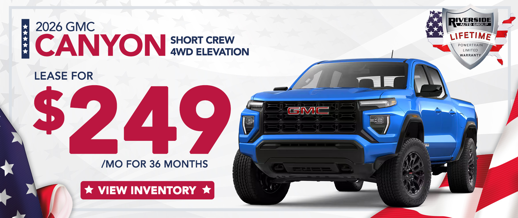 Example based on survey. Each dealer sets own price. $249/month for 36 months. Your payments may vary. For eligible new and unused models leased through GM Financial. Payments are for a 2026 GMC Canyon Short Crew 4WD Elevation with an MSRP of $44,295. Based on due at signing amount of $4,269 (after all offers). 36 monthly payments total $8,964. Option to purchase at lease end for an amount to be determined at lease signing. Lessor must approve lease. Take new retail delivery by 03-02-2026. Lessee pays for maintenance, repair, excess wear and disposition fee of $495 or less at end of lease. No security deposit required. Payments may be higher in some states. Not available with other offers. Lifetime limited non-factory warranty on all new vehicles. Good at participating dealerships nationwide. No additional charge. See dealer for details.