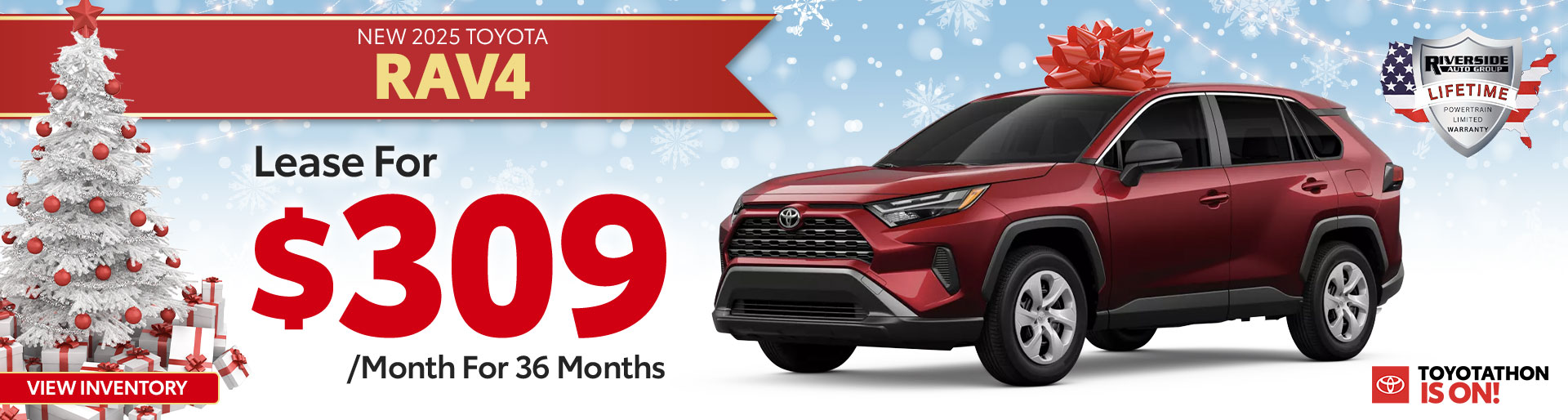Terms available on approved credit through Southeast Toyota Finance at participating Toyota dealers. Not all customers qualify. Lease example based on 2025 RAV4 2WD 5Dr. Wagon LE L4 8AT Model 4430 with Total SRP of $31,220. $4,308 Due At Signing includes $3,304 customer down payment, first month's payment of $309, and $695 Acquisition Fee.Tax, Title, Tags and $699 dealer fee not included in vehicle prices shown and must be paid by the purchaser. Security deposit required with exception of prior Southeast Toyota Finance (SETF) financing history and/or SETF credit rating in which a security deposit may be waived. Dealer contribution may vary and could affect lease payment. Individual dealer prices, other terms and offers may vary. Must lease from participating dealer's stock and terms are subject to vehicle availability. Lessee responsible for maintenance, excess wear and use, and will pay $0.18 per mile for all mileage over 12,000 miles per year. $350 disposition fee is due at lease end. Cannot be combined with SETF Finance Cash, Down Payment Assistance, Trade-in Assistance, Customer Cash, APR, Finance Subvention Cash. Offer available in AL, FL, GA, NC, SC; void where prohibited. Expires 01-05-2026. See your participating Toyota dealer for details. Lifetime limited non-factory warranty on all new vehicles. Good at participating dealerships nationwide. No additional charge. See dealer for details.