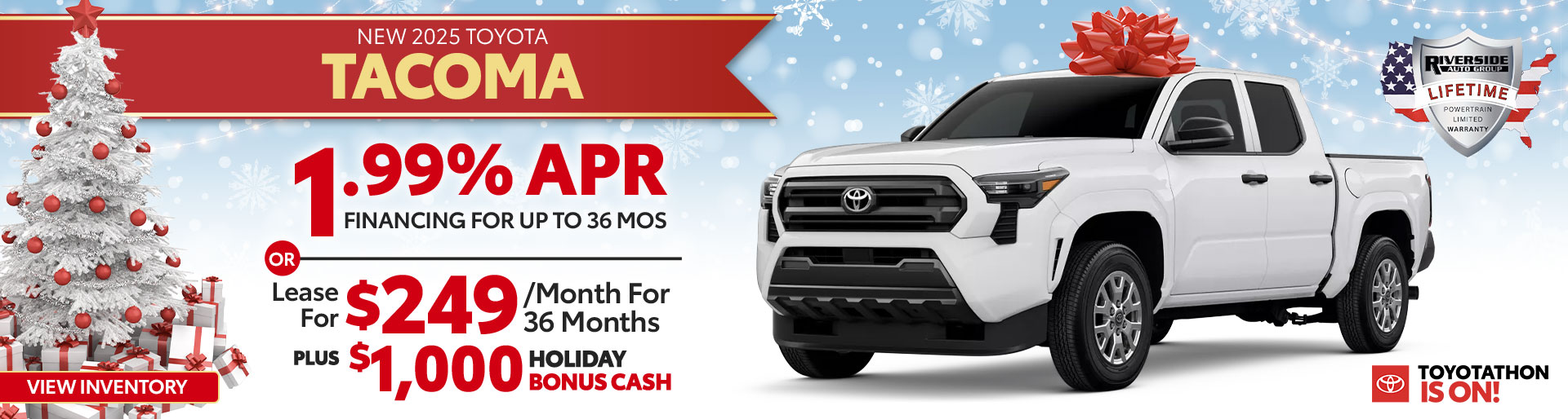 1.99% APR for 36 monthly payments of $28.64 for every $1,000 financed. Terms available on approved credit through participating Toyota dealers and Southeast Toyota Finance. For only very well qualified customers. The advertised price does not include $699 documentation fee and $59 Electronic Title Fee. The advertised price does not include sales tax, vehicle registration fees, finance charges and any other fees required by law. No down payment required if qualified for advertised offer. If you do not qualify for the offer, the amount and percentage of any down payment vary with your credit qualifications. Dealer contribution may vary and could affect price. Individual dealer prices, other terms and offers may vary. Must take retail delivery from dealer's stock and terms subject to vehicle availability. Cannot be combined with SETF Lease Cash, Down Payment Assistance, Trade-in Assistance, Customer Cash, Lease, Lease Subvention Cash. See your participating Toyota dealer for details. Offer available in AL, FL, GA, NC, SC regardless of buyer's residency; void where prohibited. Expires 01-05-26 on 2025 Tacoma 2WD Double Cab SR5 L4 8AT Model 7146 with Total SRP of $38,885. $4,248 Due At Signing includes $3,304 customer down payment, first month's payment of $249, and $695 Acquisition Fee. Tax, Title, Tags and $699 dealer fee not included in vehicle prices shown and must be paid by the purchaser.Security deposit required with exception of prior Southeast Toyota Finance (SETF) financing history and/or SETF credit rating in which a security deposit may be waived. Dealer contribution may vary and could affect lease payment. Individual dealer prices, other terms and offers may vary. Must lease from participating dealer's stock and terms are subject to vehicle availability. Lessee responsible for maintenance, excess wear and use, and will pay $0.18 per mile for all mileage over 12,000 miles per year. $350 disposition fee is due at lease end. Cannot be combined with SETF Finance Cash, Down Payment Assistance, Trade-in Assistance, Customer Cash, APR, Finance Subvention Cash. Offer available in AL, FL, GA, NC, SC; void where prohibited. Expires 01-05-2026. See your participating Toyota dealer for details. Lifetime limited non-factory warranty on all new vehicles. Good at participating dealerships nationwide. No additional charge. See dealer for details. SETF HOLIDAY BONUS CASH CAN BE COMBINED WITH THE SETF SPECIAL OR STANDARD PROGRAMS. $500 HOLIDAY BONUS CASH AVAILABLE ON 2026 CAMRY HYBRID, 2026 COROLLA G/H, AND 2026 PRIUS LIFTBACK (EXCLUDES COROLLA HATCH, CROSS & GR COROLLA, AND PRIUS PRIME/PHEV). $1,000 HOLIDAY BONUS CASH AVAILABLE ON 2025/2026 TACOMA GAS/HYBRID, 2025/2026 TUNDRA GAS/HYBRID, AND 2025 4RUNNER GAS/HYBRID (EXCLUDES TRD PRO 7598, 8424, 8634, AND TRAILHUNTER 7536, 7538, 8636). $1,500 HOLIDAY BONUS CASH AVAILABLE ON 2026 PRIUS PHEV, 2025 PRIUS PHEV, AND 2025 RAV4 PHEV (EXCLUDES PRIUS LIFTBACK AND RAV4 GAS/HYBRID). MUST FINANCE OR LEASE THROUGH SETF WITH APPROVED CREDIT. NOT ALL BUYERS WILL QUALIFY. SEE DEALER FOR COMPLETE DETAILS. VEHICLE MUST BE RETAILED BY 01/05/2026