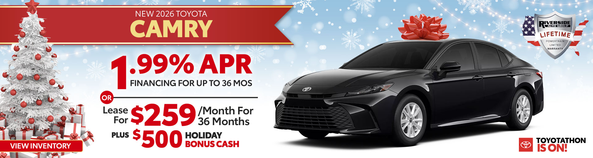 1.99% APR for 36 monthly payments of $28.64 for every $1,000 financed. Terms available on approved credit through participating Toyota dealers and Southeast Toyota Finance. For only very well qualified customers. The advertised price does not include $699 documentation fee and $59 Electronic Title Fee. The advertised price does not include sales tax, vehicle registration fees, finance charges and any other fees required by law. No down payment required if qualified for advertised offer. If you do not qualify for the offer, the amount and percentage of any down payment vary with your credit qualifications. Dealer contribution may vary and could affect price. Individual dealer prices, other terms and offers may vary. Must take retail delivery from dealer's stock and terms subject to vehicle availability. Cannot be combined with SETF Lease Cash, Down Payment Assistance, Trade-in Assistance, Customer Cash, Lease, Lease Subvention Cash. See your participating Toyota dealer for details. Offer available in AL, FL, GA, NC, SC regardless of buyer's residency; void where prohibited. Expires 01-05-2026 on 2026 Camry 2WD 4Dr. Sedan LE Hybrid CVT Model 2559 with Total SRP of $30,160. $4,258 Due At Signing includes $3,304 customer down payment, first month's payment of $259, and $695 Acquisition FeeTax, Title, Tags and $699 dealer fee not included in vehicle prices shown and must be paid by the purchaser.. Security deposit required with exception of prior Southeast Toyota Finance (SETF) financing history and/or SETF credit rating in which a security deposit may be waived. Dealer contribution may vary and could affect lease payment. Individual dealer prices, other terms and offers may vary. Must lease from participating dealer's stock and terms are subject to vehicle availability. Lessee responsible for maintenance, excess wear and use, and will pay $0.18 per mile for all mileage over 12,000 miles per year. $350 disposition fee is due at lease end. Cannot be combined with SETF Finance Cash, Down Payment Assistance, Trade-in Assistance, Customer Cash, APR, Finance Subvention Cash. Offer available in AL, FL, GA, NC, SC; void where prohibited. Expires 01-05-2026. See your participating Toyota dealer for details.Lifetime limited non-factory warranty on all new vehicles. Good at participating dealerships nationwide. No additional charge. See dealer for details.SETF HOLIDAY BONUS CASH CAN BE COMBINED WITH THE SETF SPECIAL OR STANDARD PROGRAMS. $500 HOLIDAY BONUS CASH AVAILABLE ON 2026 CAMRY HYBRID, 2026 COROLLA G/H, AND 2026 PRIUS LIFTBACK (EXCLUDES COROLLA HATCH, CROSS & GR COROLLA, AND PRIUS PRIME/PHEV). $1,000 HOLIDAY BONUS CASH AVAILABLE ON 2025/2026 TACOMA GAS/HYBRID, 2025/2026 TUNDRA GAS/HYBRID, AND 2025 4RUNNER GAS/HYBRID (EXCLUDES TRD PRO 7598, 8424, 8634, AND TRAILHUNTER 7536, 7538, 8636). $1,500 HOLIDAY BONUS CASH AVAILABLE ON 2026 PRIUS PHEV, 2025 PRIUS PHEV, AND 2025 RAV4 PHEV (EXCLUDES PRIUS LIFTBACK AND RAV4 GAS/HYBRID). MUST FINANCE OR LEASE THROUGH SETF WITH APPROVED CREDIT. NOT ALL BUYERS WILL QUALIFY. SEE DEALER FOR COMPLETE DETAILS. VEHICLE MUST BE RETAILED BY 01-05-2026