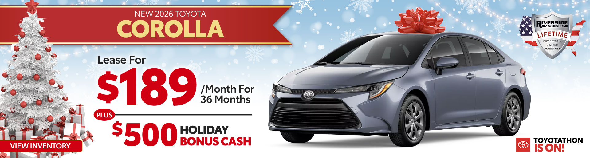 on 2026 Corolla 2WD 4Dr. Sedan LE L4 CVT-F Model 1852 with Total SRP of $23,885. $4,188 Due At Signing includes $3,304 customer down payment, first month's payment of $189, and $695 Acquisition Fee.Tax, Title, Tags and $699 dealer fee not included in vehicle prices shown and must be paid by the purchaser. Security deposit required with exception of prior Southeast Toyota Finance (SETF) financing history and/or SETF credit rating in which a security deposit may be waived. Dealer contribution may vary and could affect lease payment. Individual dealer prices, other terms and offers may vary. Must lease from participating dealer's stock and terms are subject to vehicle availability. Lessee responsible for maintenance, excess wear and use, and will pay $0.18 per mile for all mileage over 12,000 miles per year. $350 disposition fee is due at lease end. Cannot be combined with SETF Finance Cash, Down Payment Assistance, Trade-in Assistance, Customer Cash, APR, Finance Subvention Cash. Offer available in AL, FL, GA, NC, SC; void where prohibited. Expires 01-05-2026. See your participating Toyota dealer for details. Lifetime limited non-factory warranty on all new vehicles. Good at participating dealerships nationwide. No additional charge. See dealer for details. SETF HOLIDAY BONUS CASH CAN BE COMBINED WITH THE SETF SPECIAL OR STANDARD PROGRAMS. $500 HOLIDAY BONUS CASH AVAILABLE ON 2026 CAMRY HYBRID, 2026 COROLLA G/H, AND 2026 PRIUS LIFTBACK (EXCLUDES COROLLA HATCH, CROSS & GR COROLLA, AND PRIUS PRIME/PHEV). $1,000 HOLIDAY BONUS CASH AVAILABLE ON 2025/2026 TACOMA GAS/HYBRID, 2025/2026 TUNDRA GAS/HYBRID, AND 2025 4RUNNER GAS/HYBRID (EXCLUDES TRD PRO 7598, 8424, 8634, AND TRAILHUNTER 7536, 7538, 8636). $1,500 HOLIDAY BONUS CASH AVAILABLE ON 2026 PRIUS PHEV, 2025 PRIUS PHEV, AND 2025 RAV4 PHEV (EXCLUDES PRIUS LIFTBACK AND RAV4 GAS/HYBRID). MUST FINANCE OR LEASE THROUGH SETF WITH APPROVED CREDIT. NOT ALL BUYERS WILL QUALIFY. SEE DEALER FOR COMPLETE DETAILS. VEHICLE MUST BE RETAILED BY 01/05/2026.