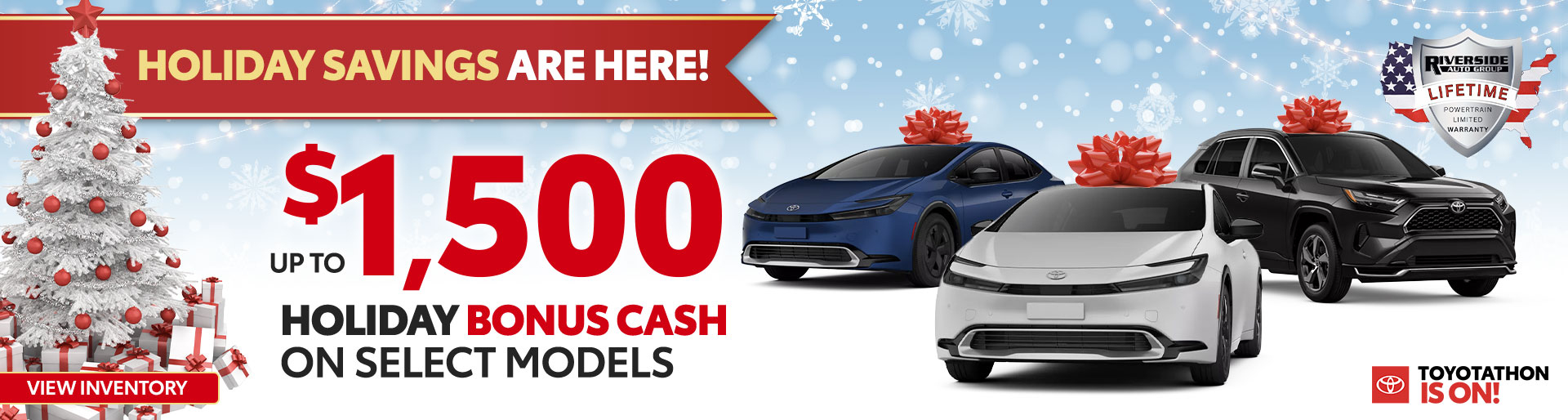SETF HOLIDAY BONUS CASH CAN BE COMBINED WITH THE SETF SPECIAL OR STANDARD PROGRAMS.1,500 HOLIDAY BONUS CASH AVAILABLE ON 2026 PRIUS PHEV, 2025 PRIUS PHEV, AND 2025 RAV4 PHEV (EXCLUDES PRIUS LIFTBACK AND RAV4 GAS/HYBRID). MUST FINANCE OR LEASE THROUGH SETF WITH APPROVED CREDIT. NOT ALL BUYERS WILL QUALIFY. SEE DEALER FOR COMPLETE DETAILS. VEHICLE MUST BE RETAILED BY 01/05/2026