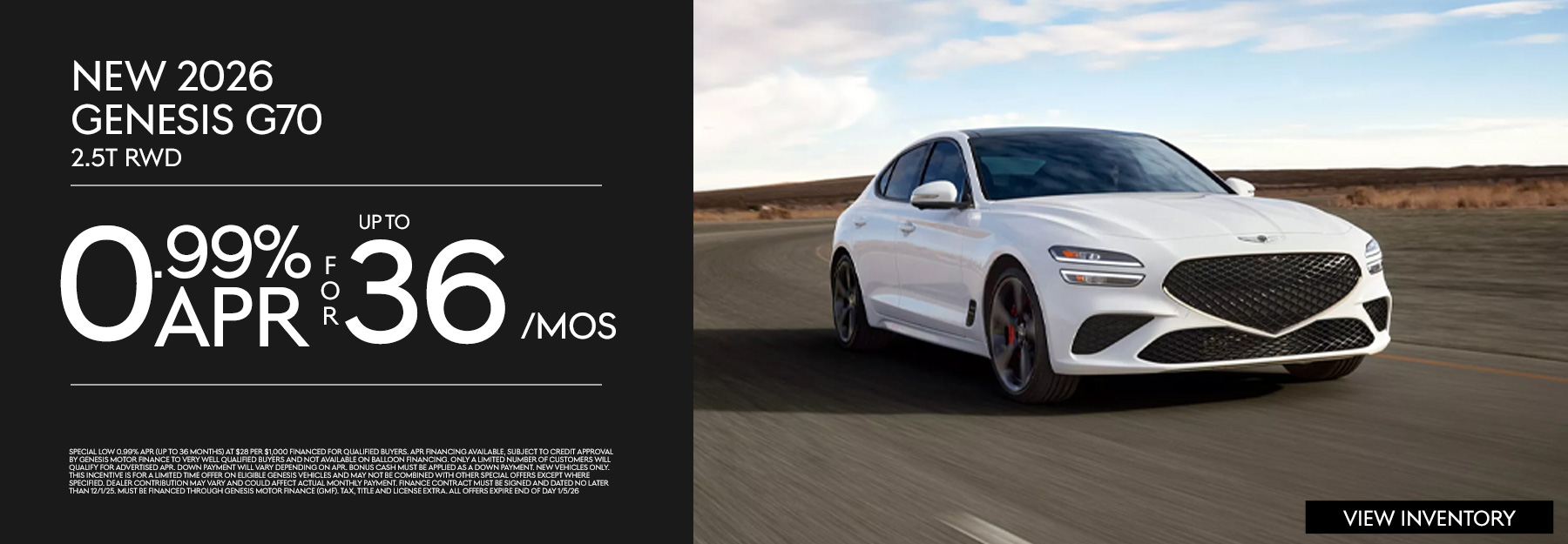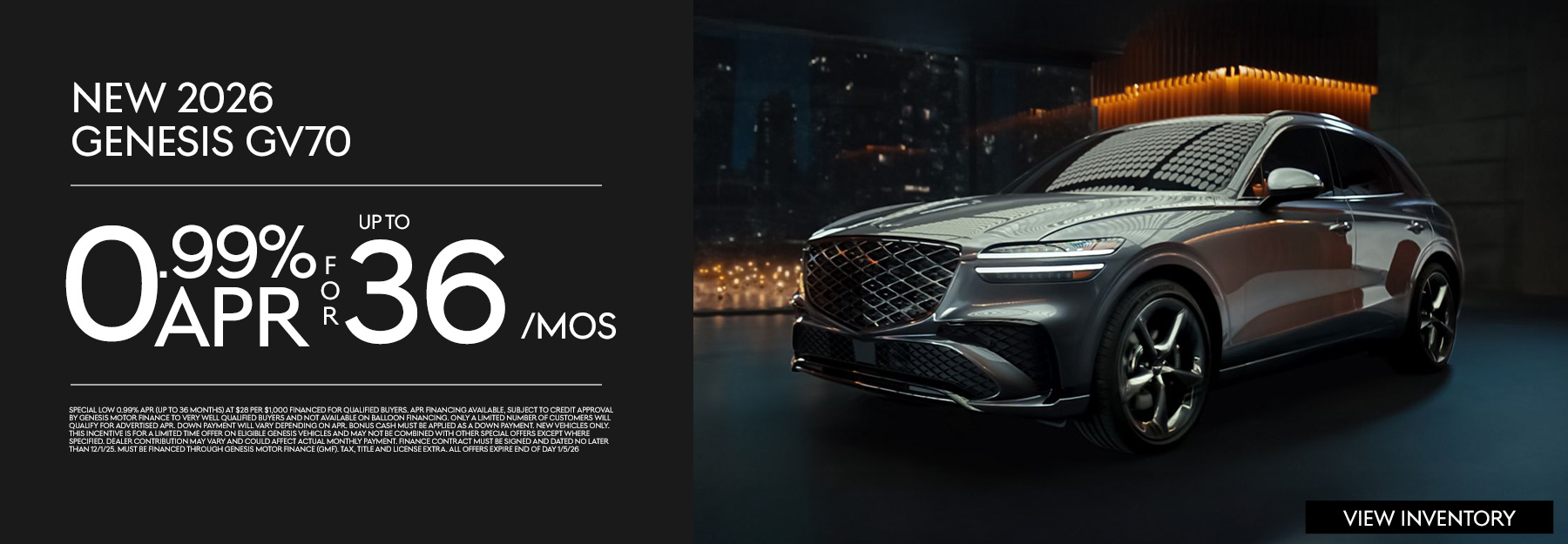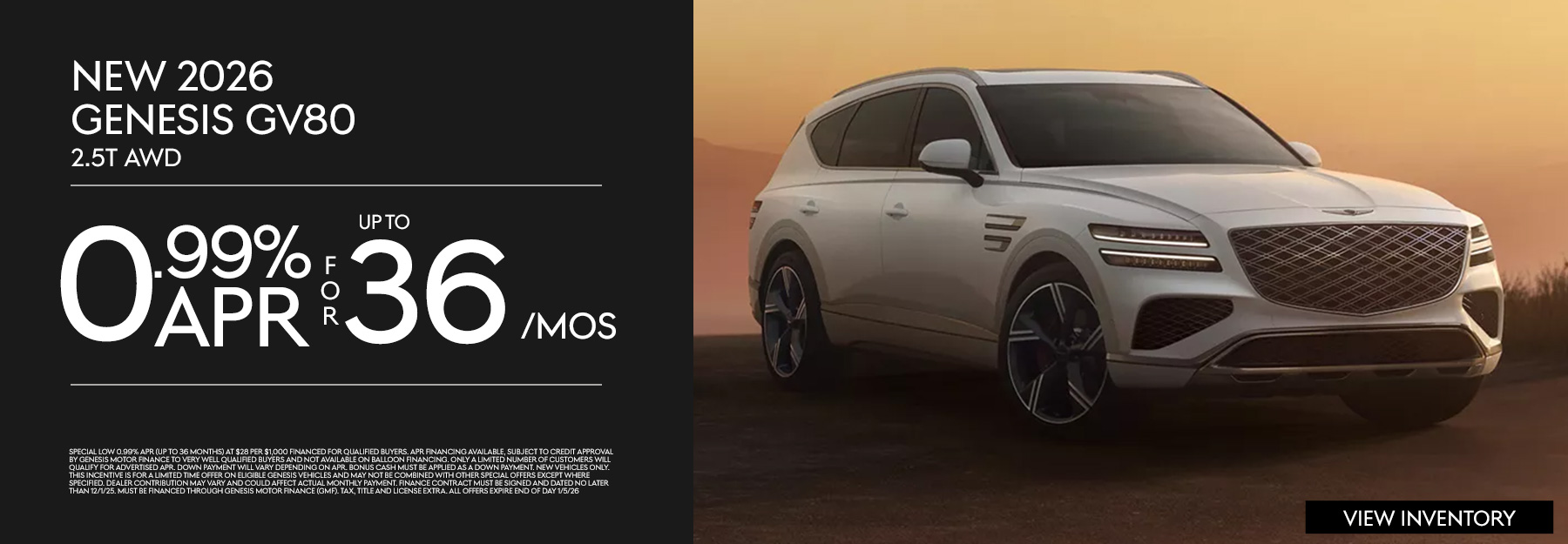 SPECIAL LOW 0.99% APR (UP TO 36 MONTHS) AT $28 PER $1,000 FINANCED FOR QUALIFIED BUYERS. APR FINANCING AVAILABLE, SUBJECT TO CREDIT APPROVAL BY GENESIS MOTOR FINANCE TO VERY WELL QUALIFIED BUYERS AND NOT AVAILABLE ON BALLOON FINANCING. ONLY A LIMITED NUMBER OF CUSTOMERS WILL QUALIFY FOR ADVERTISED APR. DOWN PAYMENT WILL VARY DEPENDING ON APR. BONUS CASH MUST BE APPLIED AS A DOWN PAYMENT. NEW VEHICLES ONLY. THIS INCENTIVE IS FOR A LIMITED TIME OFFER ON ELIGIBLE GENESIS VEHICLES AND MAY NOT BE COMBINED WITH OTHER SPECIAL OFFERS EXCEPT WHERE SPECIFIED. DEALER CONTRIBUTION MAY VARY AND COULD AFFECT ACTUAL MONTHLY PAYMENT. FINANCE CONTRACT MUST BE SIGNED AND DATED NO LATER THAN 12/1/25. MUST BE FINANCED THROUGH GENESIS MOTOR FINANCE (GMF). TAX, TITLE AND LICENSE EXTRA. ALL OFFERS EXPIRE END OF DAY 1/5/26