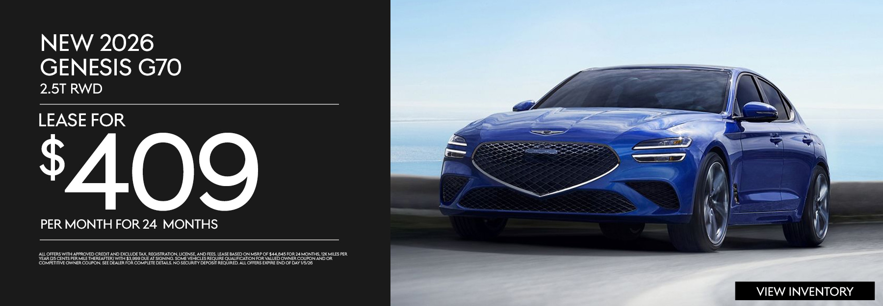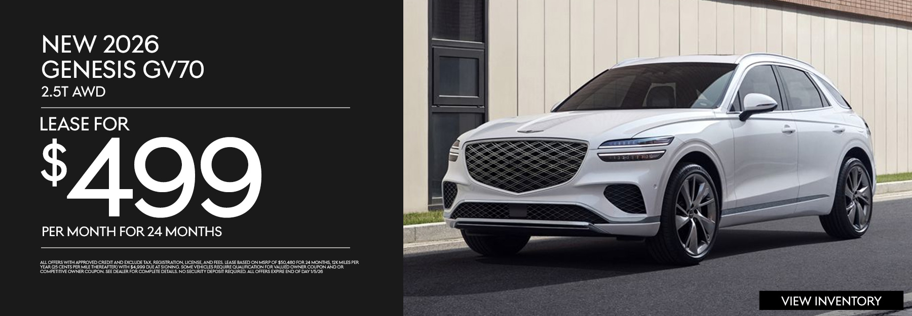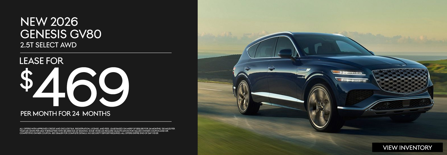 SPECIAL LOW 0.99% APR (UP TO 36 MONTHS) AT $28 PER $1,000 FINANCED FOR QUALIFIED BUYERS. APR FINANCING AVAILABLE, SUBJECT TO CREDIT APPROVAL BY GENESIS MOTOR FINANCE TO VERY WELL QUALIFIED BUYERS AND NOT AVAILABLE ON BALLOON FINANCING. ONLY A LIMITED NUMBER OF CUSTOMERS WILL QUALIFY FOR ADVERTISED APR. DOWN PAYMENT WILL VARY DEPENDING ON APR. BONUS CASH MUST BE APPLIED AS A DOWN PAYMENT. NEW VEHICLES ONLY. THIS INCENTIVE IS FOR A LIMITED TIME OFFER ON ELIGIBLE GENESIS VEHICLES AND MAY NOT BE COMBINED WITH OTHER SPECIAL OFFERS EXCEPT WHERE SPECIFIED. DEALER CONTRIBUTION MAY VARY AND COULD AFFECT ACTUAL MONTHLY PAYMENT. FINANCE CONTRACT MUST BE SIGNED AND DATED NO LATER THAN 12/1/25. MUST BE FINANCED THROUGH GENESIS MOTOR FINANCE (GMF). TAX, TITLE AND LICENSE EXTRA. ALL OFFERS EXPIRE END OF DAY 1/5/26